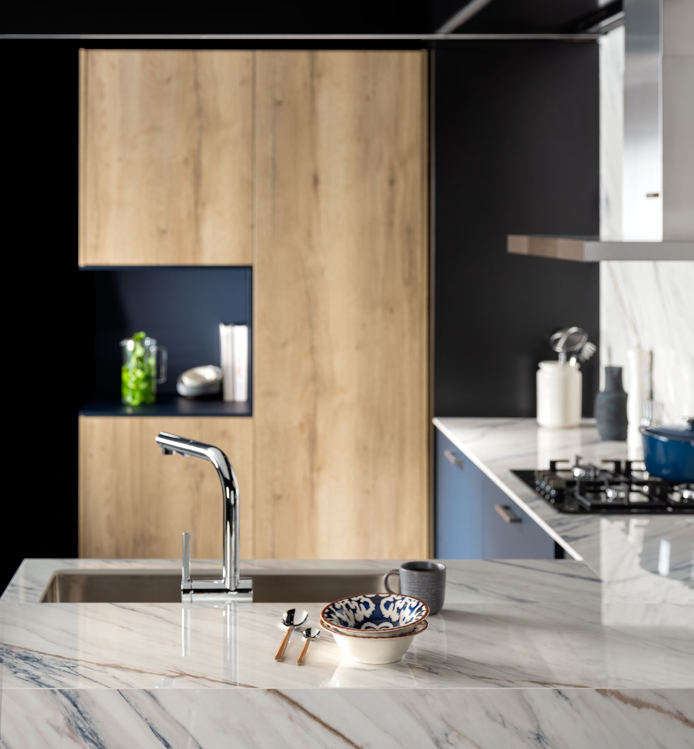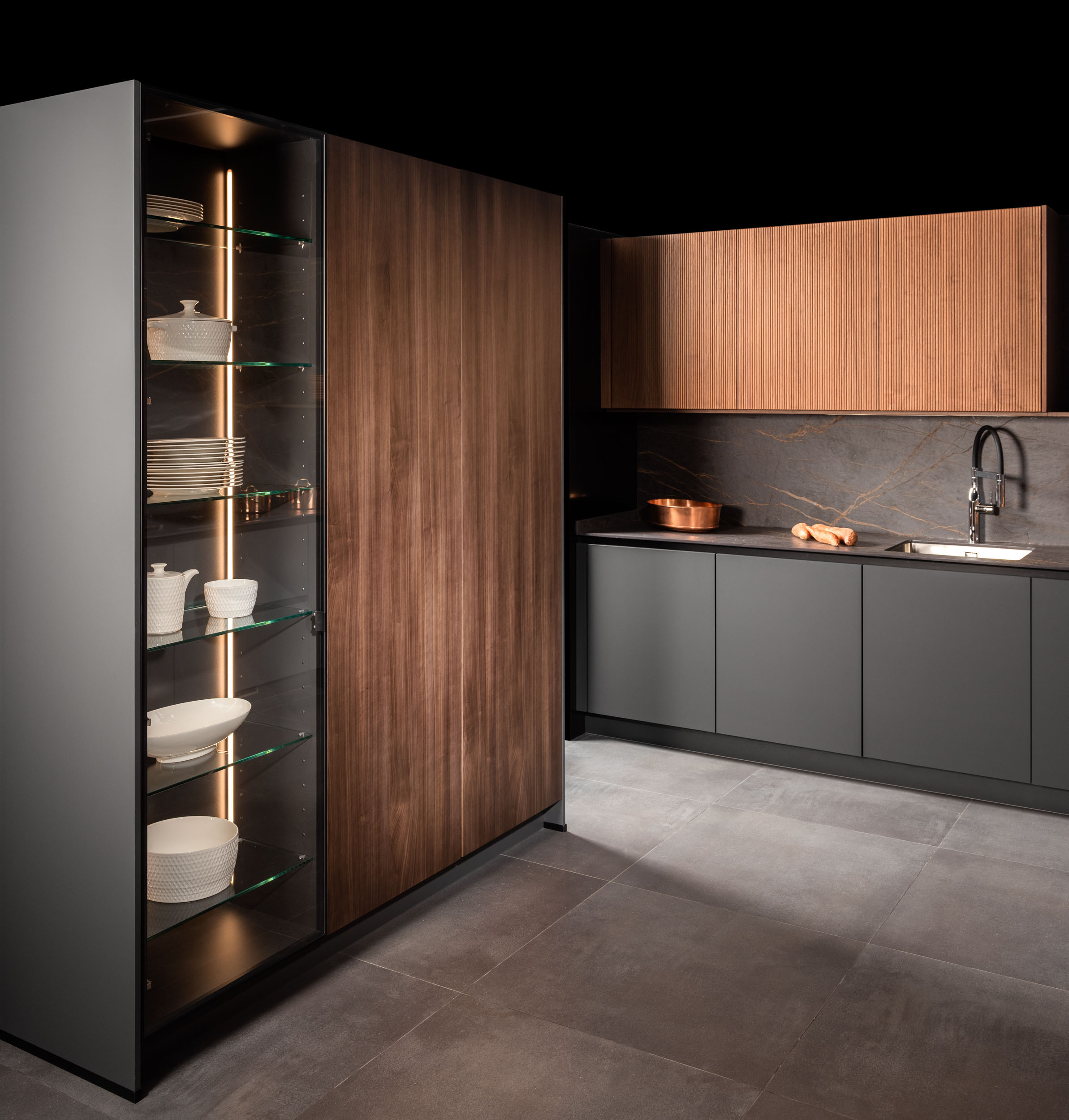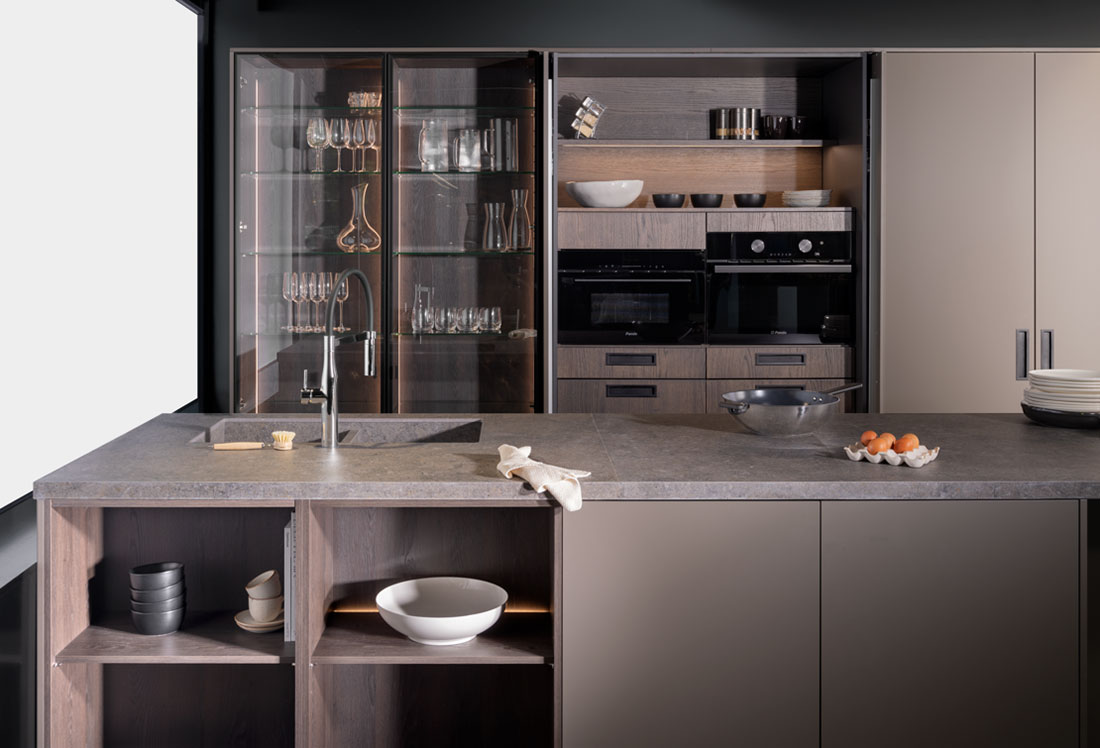 Cuando hablamos de vitrinas, nos referimos al interiorismo aplicado, ya que son muebles diseñados para mostrar su contenido y convertirse en expositores de vajillas o cristalerías. Con o sin luz, diferentes alturas y personalización de interiores, las opciones son infinitas. Las puertas escamoteables permiten acercar aún más la cocina al comedor. Con las puertas cerradas, se consigue una línea de muebles limpia y elegante. Al abrirlas, se revelan todas las opciones disponibles, pudiendo tener en el interior el fregadero o incluso la zona de cocción.