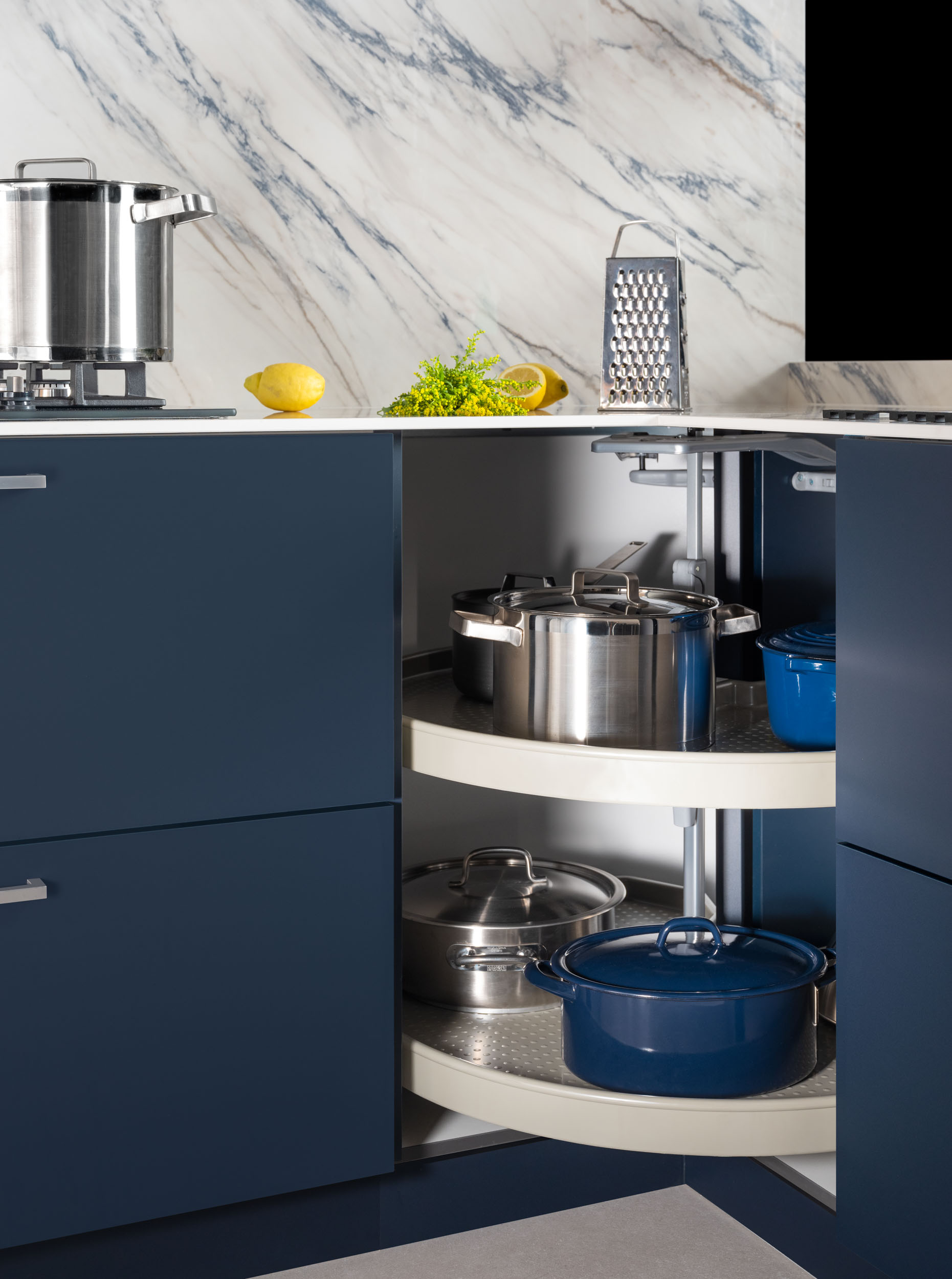 Nuestros asesores te propondrán las mejores soluciones para tu cocina. Gracias a nuestra amplia gama de productos, podemos solucionar hasta el detalle más pequeño, como el mueble esquinero giratorio con dos bandejas de esta imagen. Esta solución te permite acceder cómodamente a todo lo que tengas guardado, sin esfuerzo. Las opciones de tiradores y puertas de madera u otros materiales son extensas, ofreciendo una gran variedad de posibilidades.