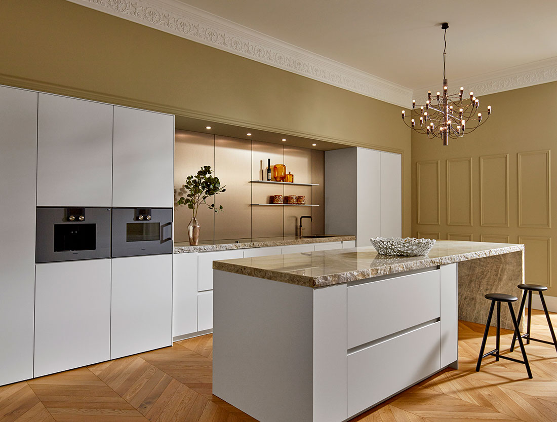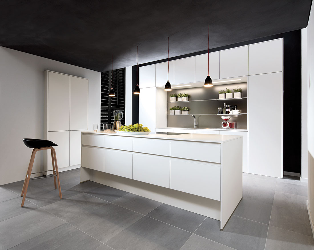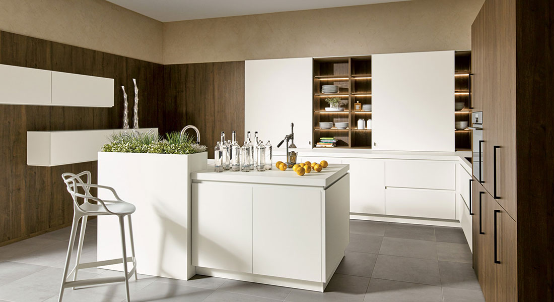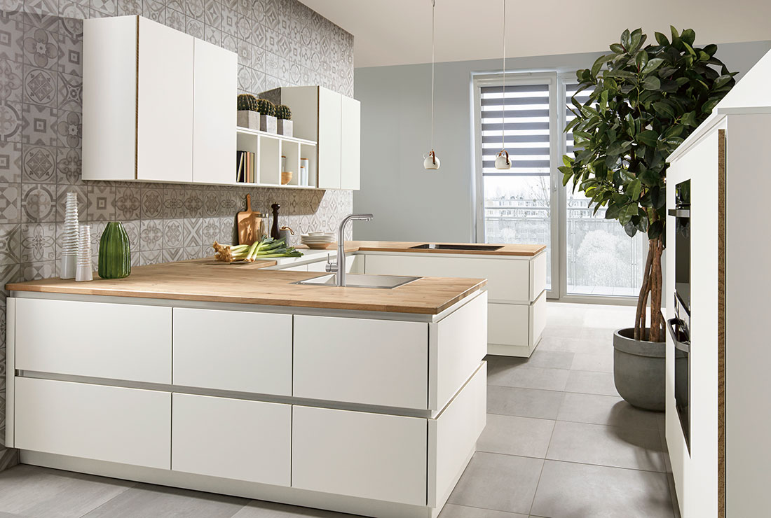 El color blanco aporta pureza, amplitud y luminosidad a cualquier espacio, ya sea pequeño o grande. Este tono tan versátil permite hacer multitud de combinaciones en diferentes medidas de muebles y sistemas de apertura, adaptándose a cualquier estilo, desde el más moderno hasta el más clásico o rústico. Las opciones de diseño son infinitas: puertas lisas, con rayas o con marco, y sistemas de apertura de gola curva, tirador o push. Además, puedes personalizar tu cocina añadiendo una isla y vitrinas, creando un espacio único y funcional. La encimera de porcelánico blanco o la reproducción de madera con nuestro modelo “Leño Roble” aportan un toque de elegancia, completando un diseño armonioso y sofisticado. Cada elemento ha sido cuidadosamente seleccionado para ofrecer una cocina que no solo es estéticamente agradable, sino también altamente funcional, creando un ambiente acogedor y práctico.