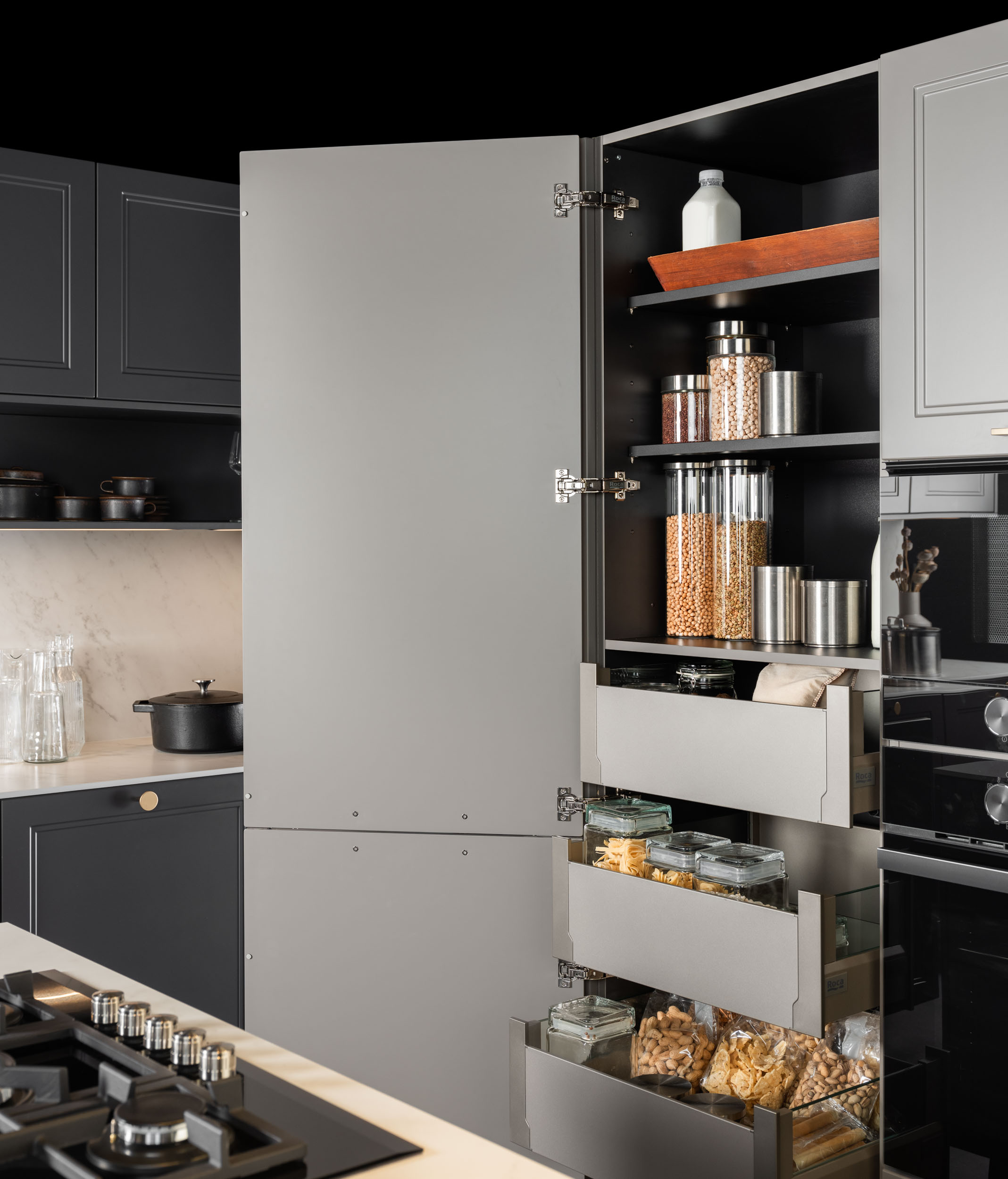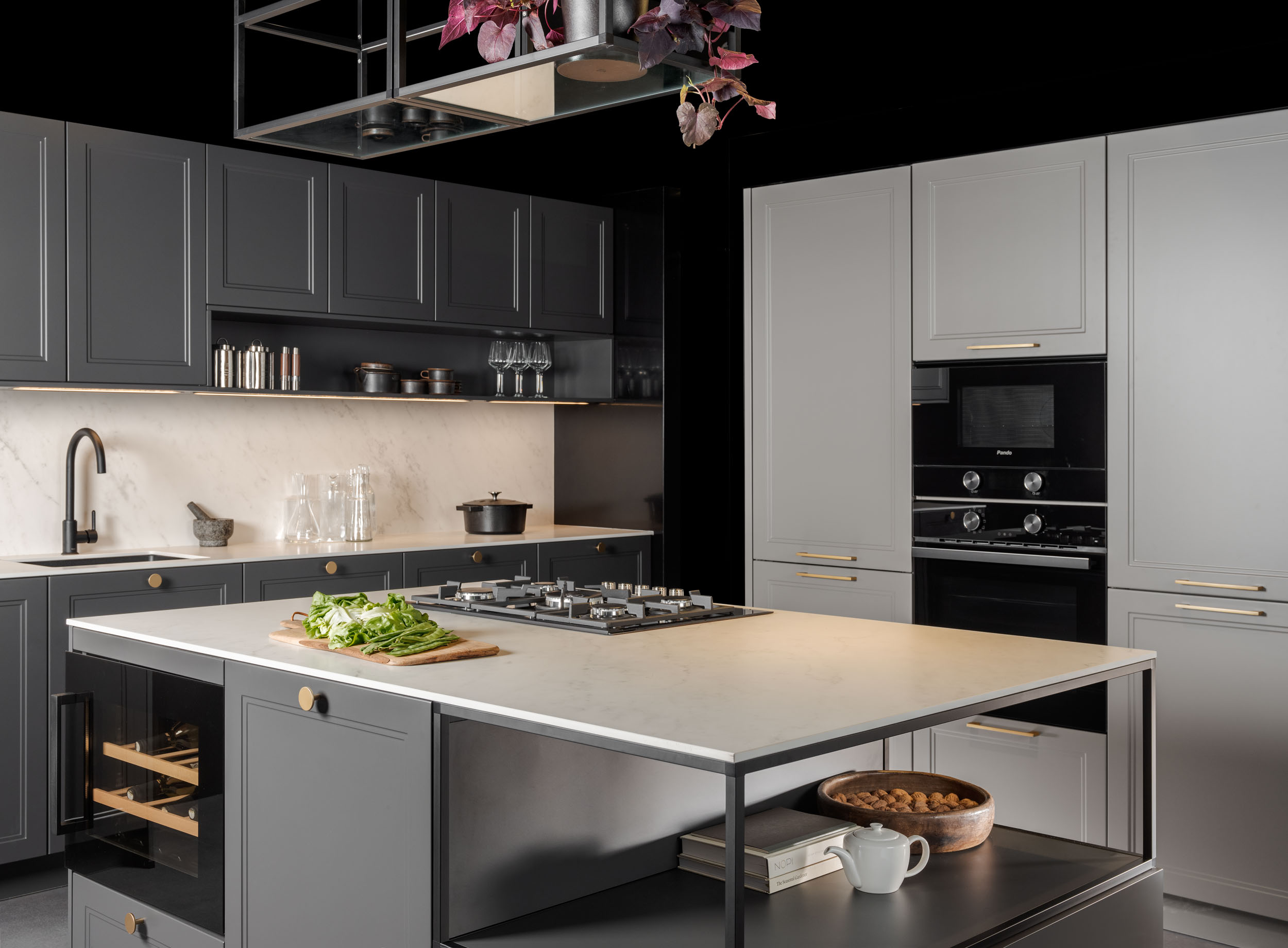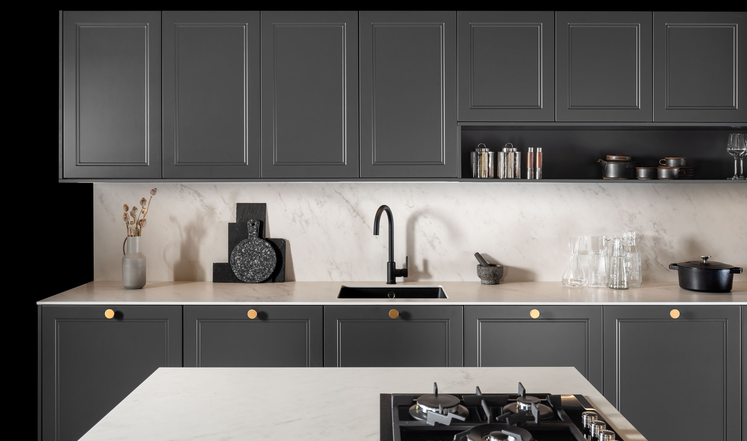 Este diseño de cocina combina elementos clásicos con toques modernos e industriales, creando un espacio versátil y elegante. Las puertas lacadas con marco estrecho en tonos grises se complementan con una encimera de porcelánico Carrara blanco y tiradores dorados, aportando un toque de sofisticación. Ideal para cualquier vivienda, ya sea en el campo o en la ciudad, este diseño se adapta perfectamente a diferentes entornos. El fregadero y el grifo en acabado negro refuerzan la estética moderna e industrial, integrándose armoniosamente en el conjunto.