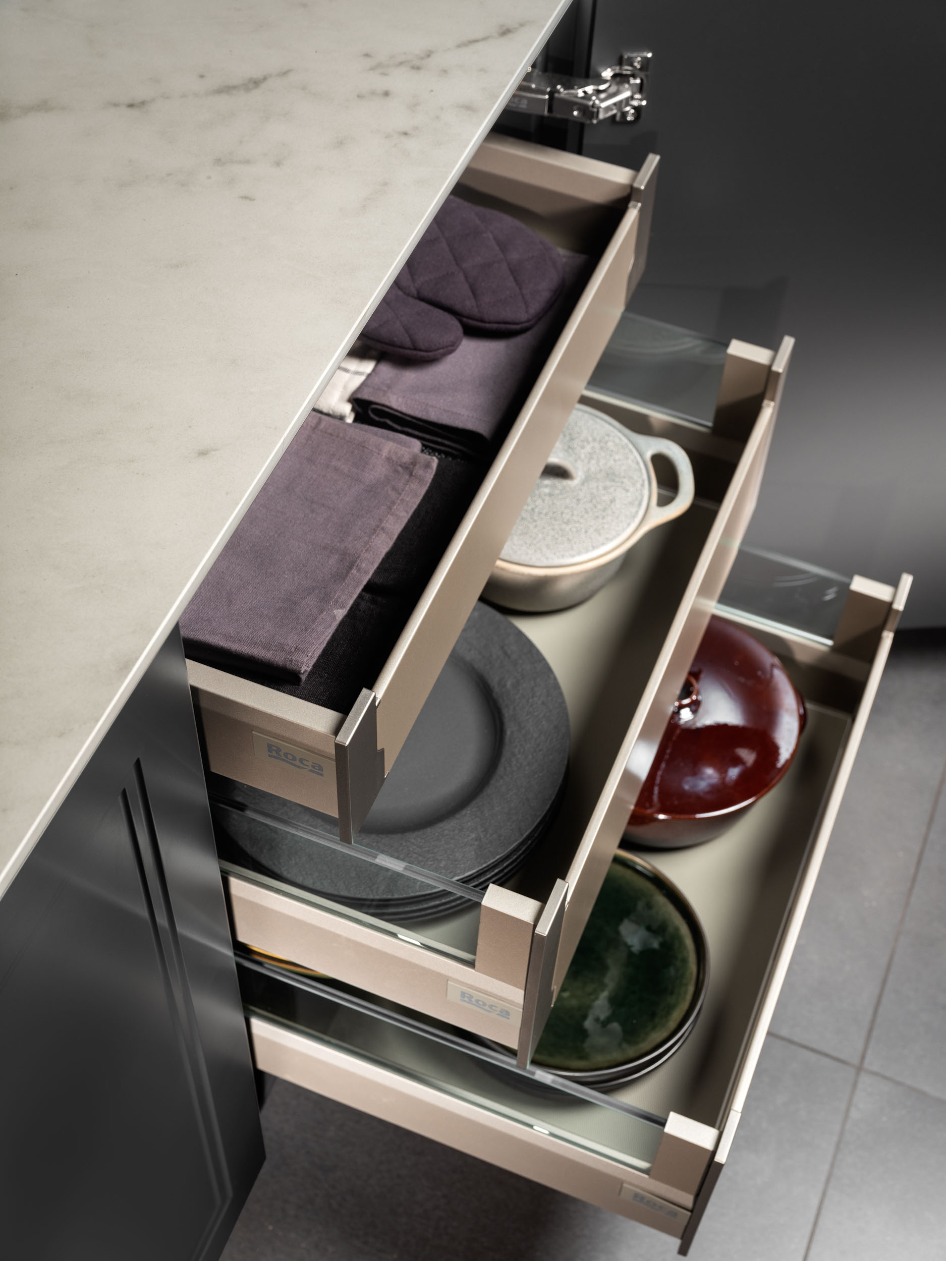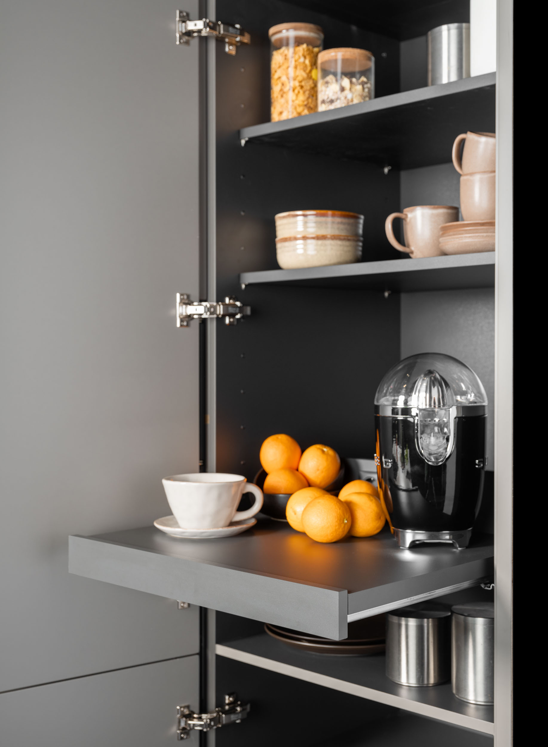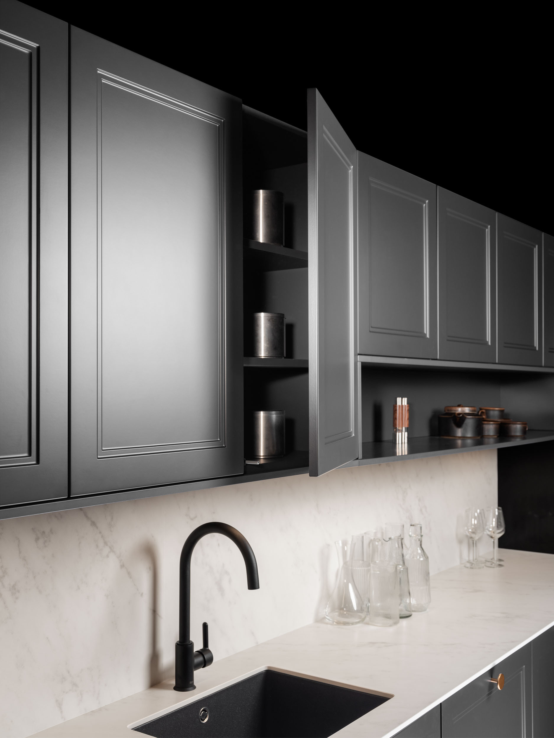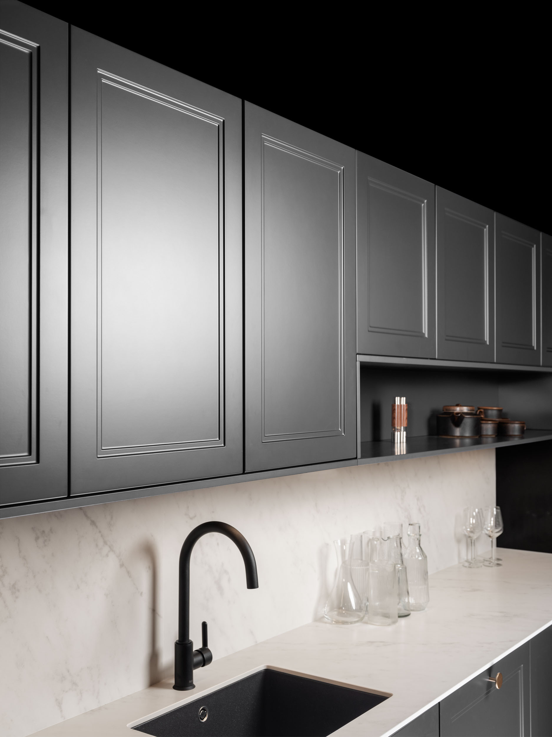 Este diseño de cocina combina elementos clásicos con toques modernos e industriales, creando un espacio versátil y elegante. Las puertas lacadas con marco estrecho en tonos grises se complementan con una encimera de porcelánico Carrara blanco y tiradores dorados, aportando un toque de sofisticación. Ideal para cualquier vivienda, ya sea en el campo o en la ciudad, este diseño se adapta perfectamente a diferentes entornos. El fregadero y el grifo en acabado negro refuerzan la estética moderna e industrial, integrándose armoniosamente en el conjunto.