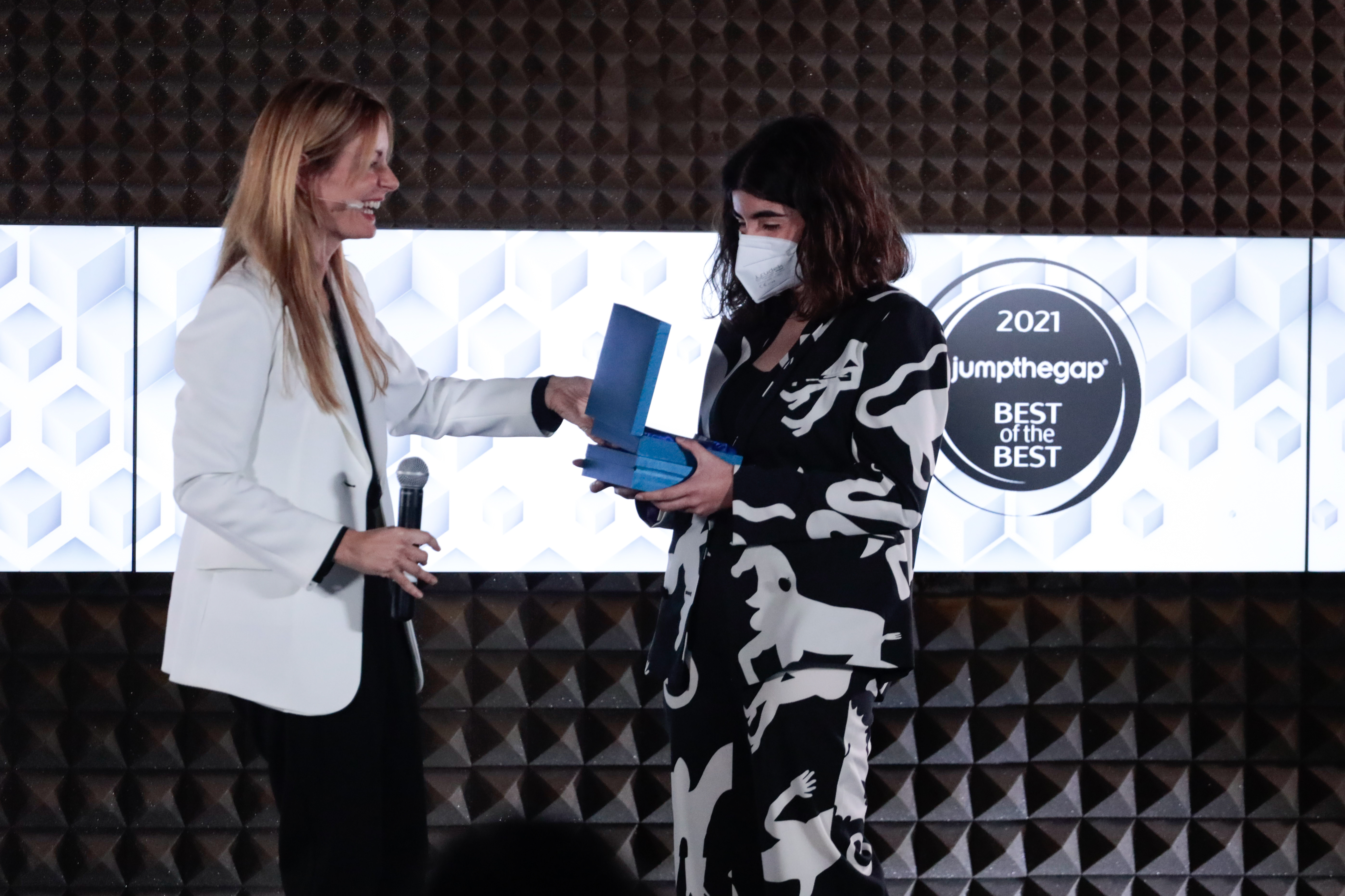 - Primer premio (2.000 euros): “Ikigai” de Laia Millan Català (España, Universidad Elisava de Barcelona). Espejo inteligente dirigido a ayudar a las personas con demencia temprana. A partir de la tecnología de reconocimiento facial, propone al usuario la realización de una serie de rutinas diarias que contribuyen a retrasar y minimizar los efectos de esta patología. Este proyecto ha sido también seleccionado como «Best of the Best» de esta décima edición de jumpthegap® y ha recibido un premio adicional de 5.000 euros.