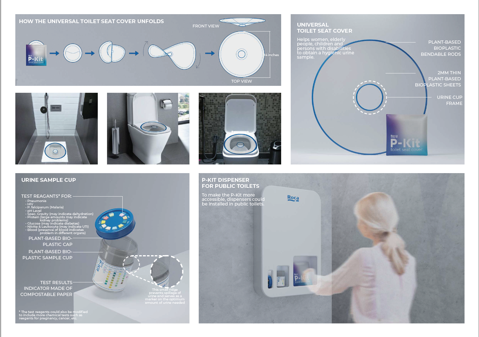 - Primer premio (2.000 euros): “P-Kit” de Andre Judiel Parabas (Filipinas, estudiante de Diseño en la University of the Philippines – Diliman). Kit biodegradable de análisis de orina de bajo coste para utilizar en el mismo espacio de baño. Permite detectar síntomas de enfermedades como diabetes, infecciones urinarias, infección del tracto, VIH, malaria o neumonía.