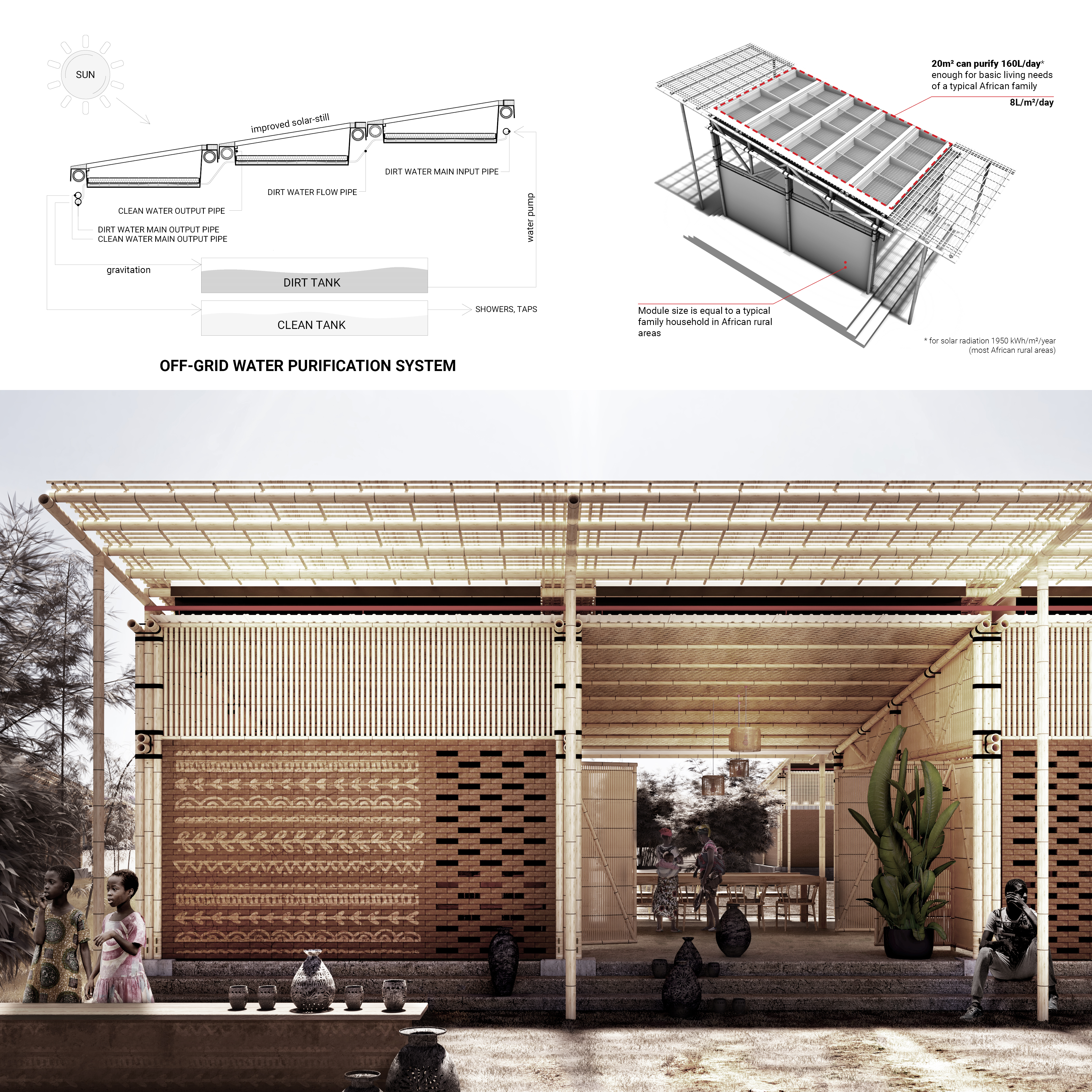 - Primer premio (2.000 euros): “Redesign disaster” de Filip Zielinski (Polonia, Delft University of Technology). Módulo de vivienda para comunidades africanas con dificultades para el acceso al agua, que integra un techo con un sistema de purificación de agua condensada y agua de lluvia mediante la energía producida por placas solares.