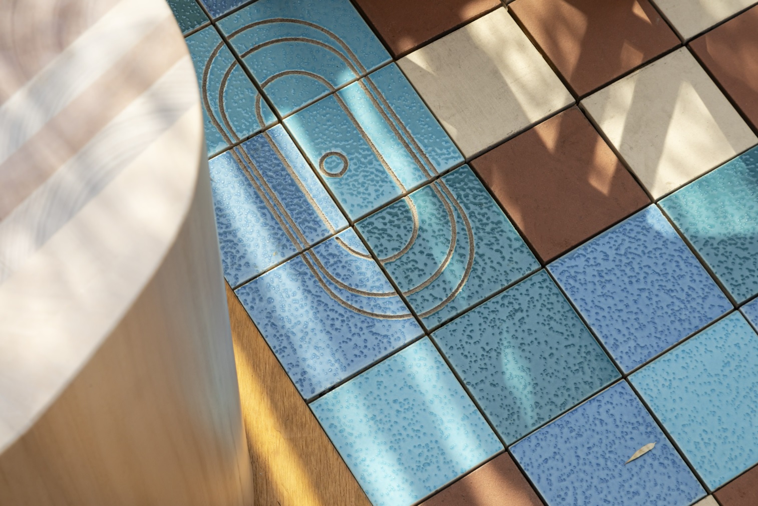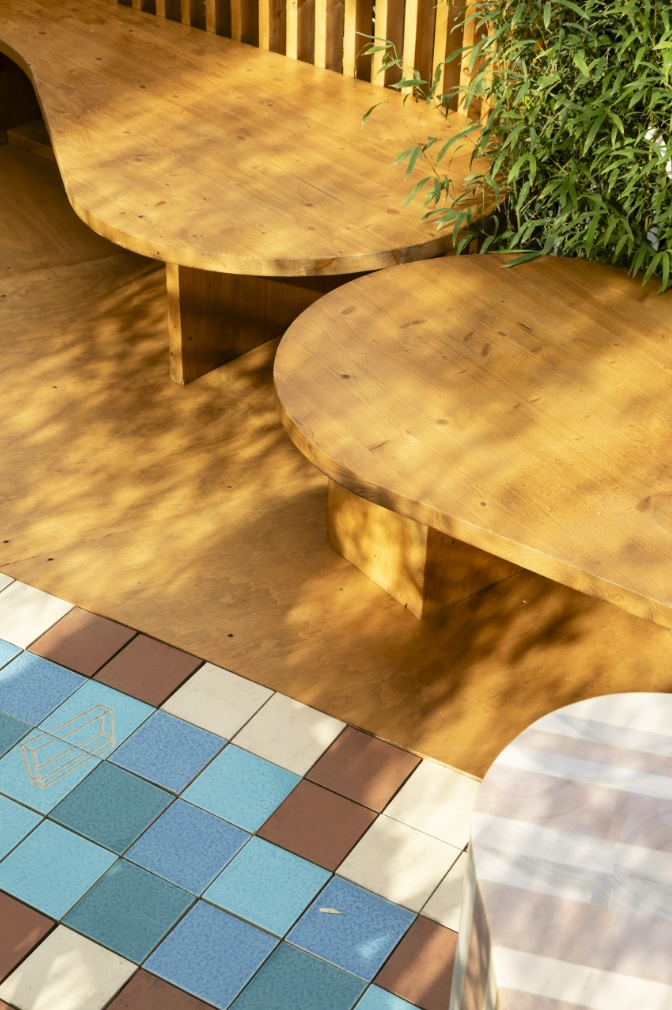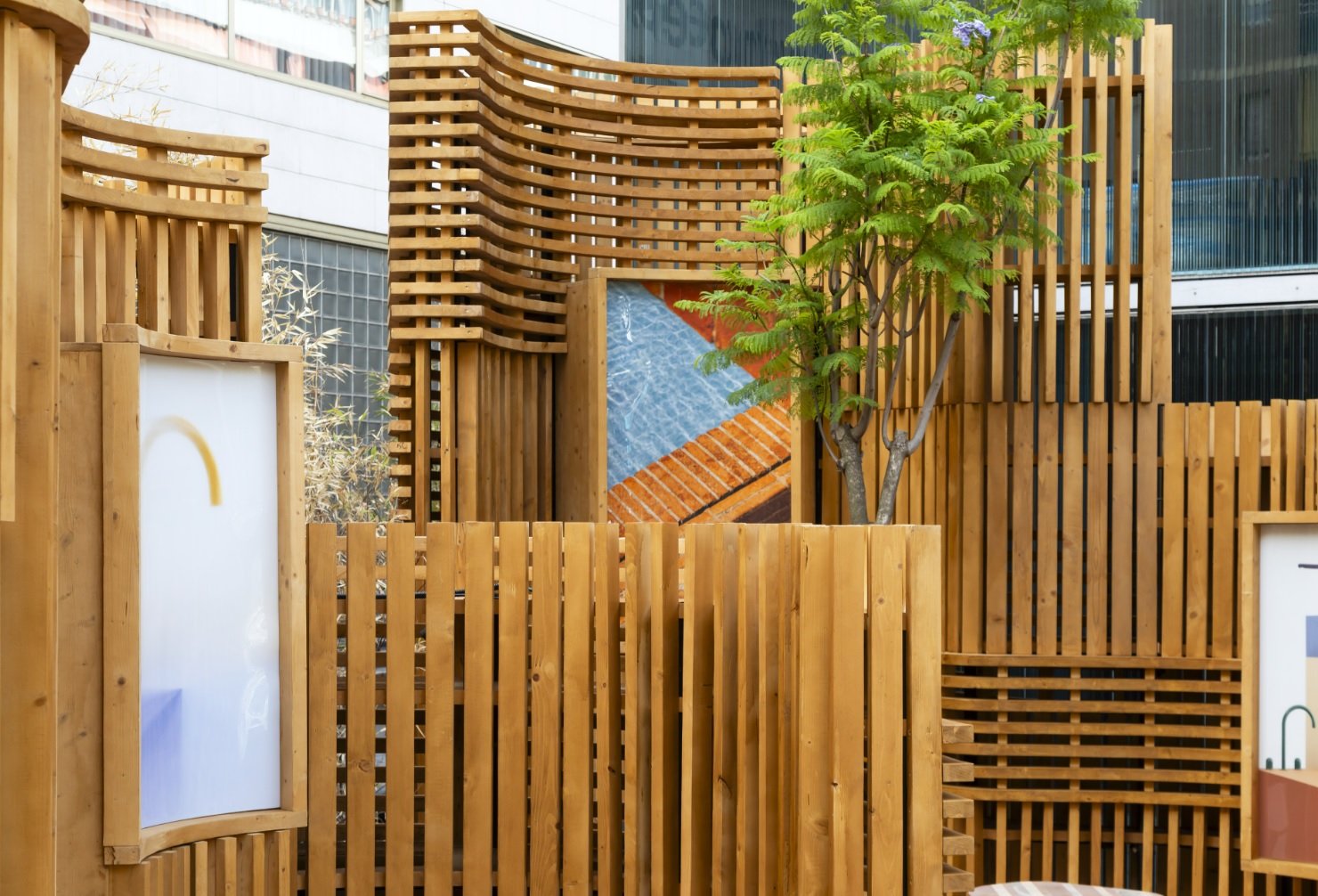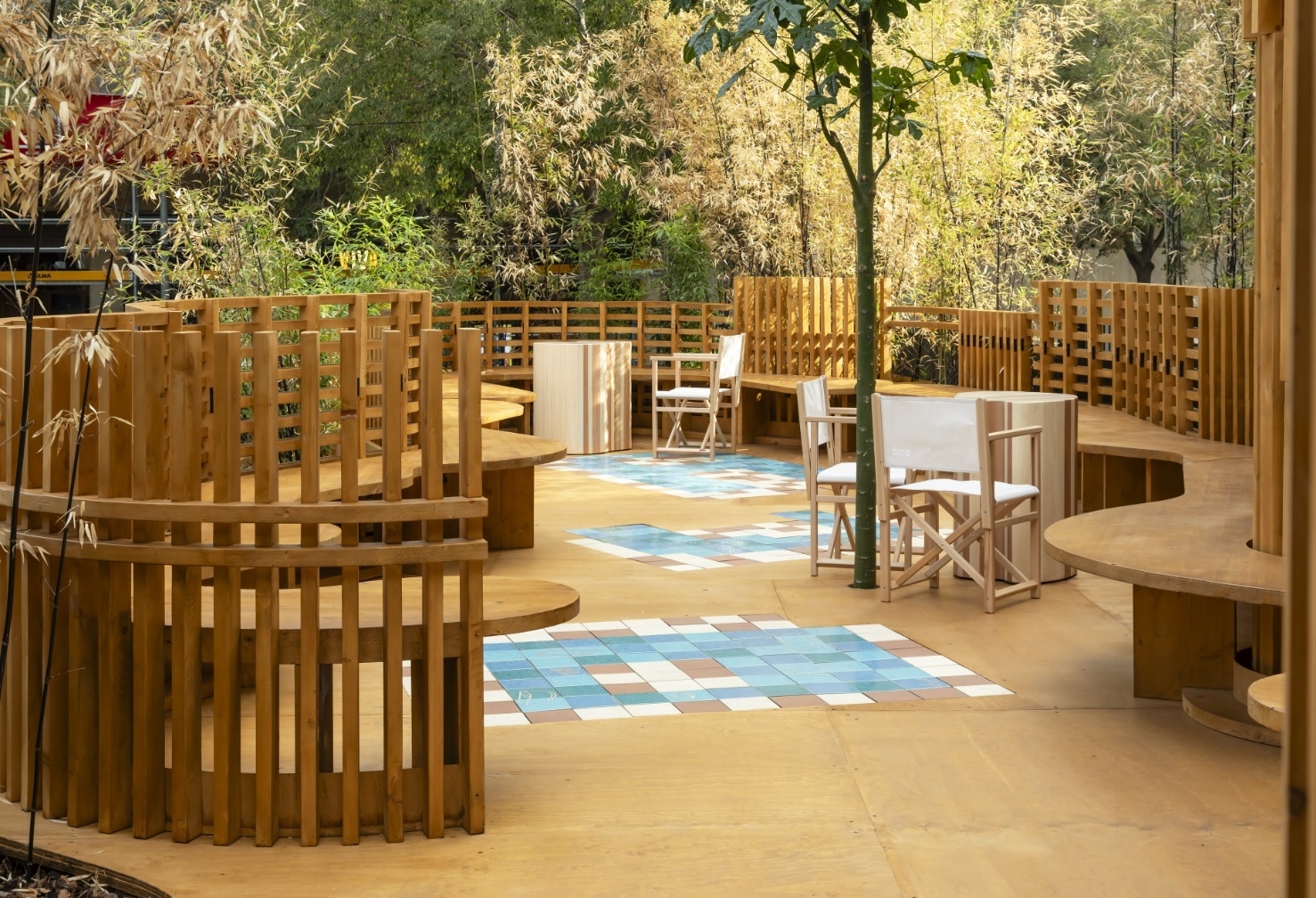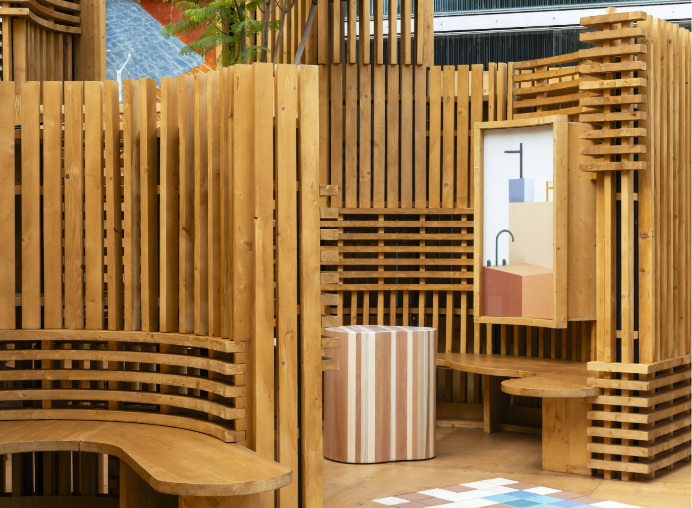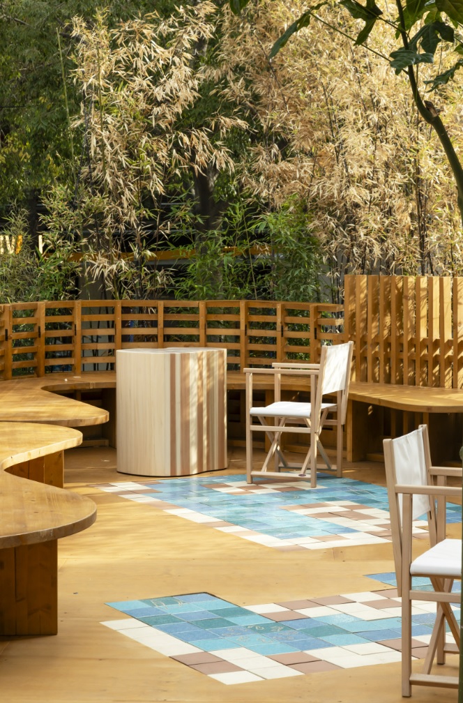 Las paredes ondulantes de madera y cerámica del pabellón se integran a la perfección en el jardín de bambú del Roca Gallery. Las celosías de madera generan diferentes niveles de transparencia, creando un juego de luces, sombras y texturas que transmiten una sensación general de bienestar inspirada en el Mediterráneo. Como complemento al ambiente natural y relajado del espacio, el pavimento del pabellón está formado por azulejos cerámicos diseñados por Benedetta Tagliabue – EMBT Architects. Éstos azulejos en suaves tonos de azul y marrón presentan dibujos alegóricos de las últimas colecciones de Roca que dan su nombre al pabellón: Nu, colección de grifería firmada por Inma Bermúdez y Tura, colección de baño diseñada por Andreu Carulla.