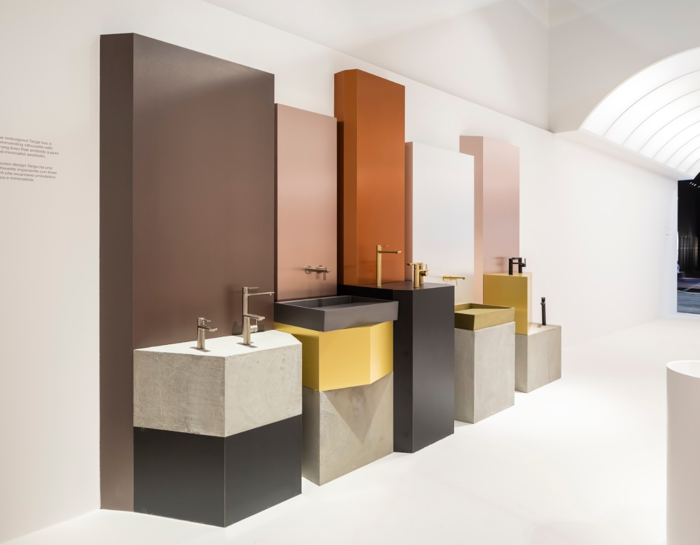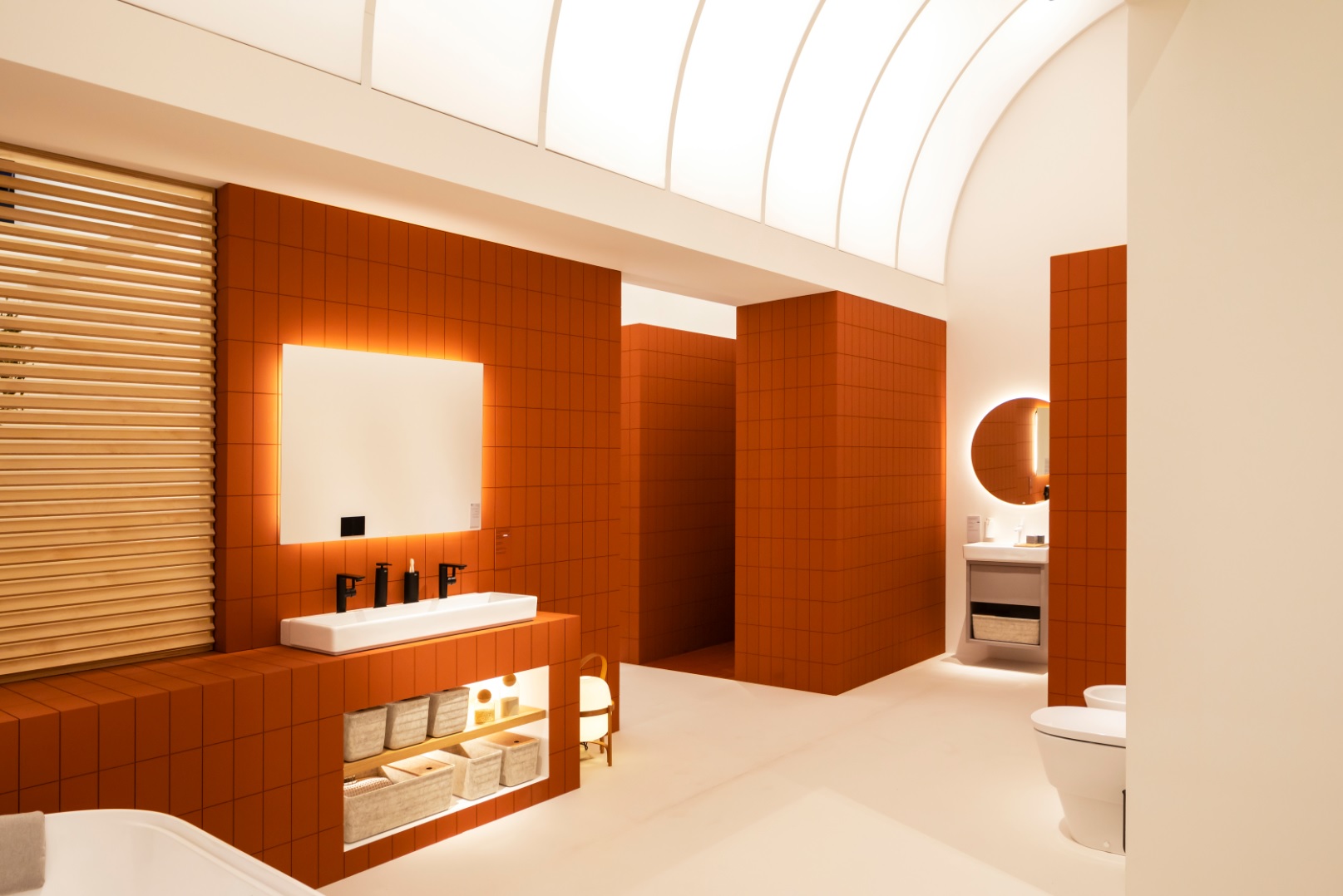 El exterior del stand está marcado por intrincados patrones geométricos que recuerdan a la arquitectura icónica que se encuentra en toda la región mediterránea. Estas geometrías externas marcan la pauta de lo que hay dentro. En el interior, estas geometrías cobran vida, transformando el espacio en un entorno multidimensional que integra las distintas colecciones de Roca. Cada área definida está dedicada a mostrar una colección específica, con una atmósfera única y una iluminación matizada que resalta las características específicas de cada producto.