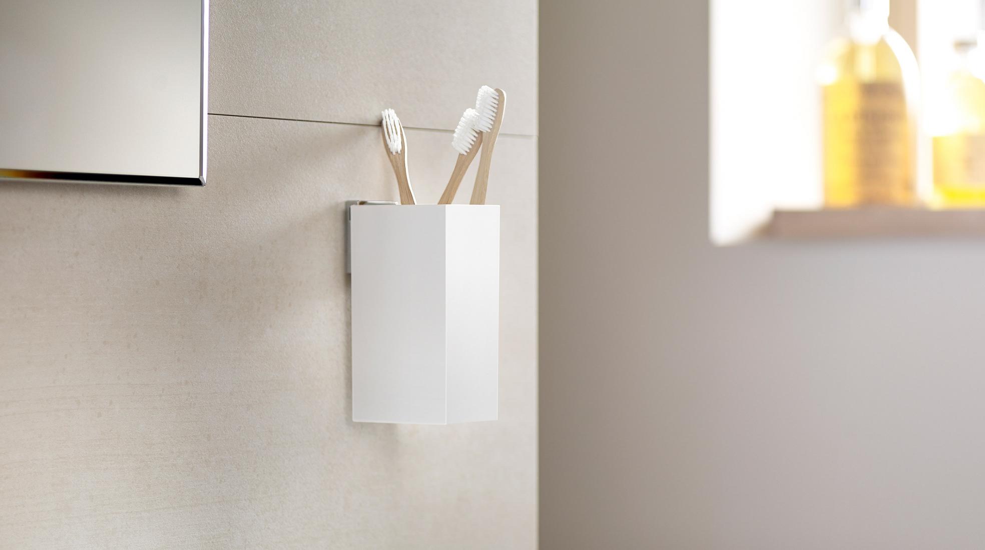 Si prefieres un diseño más actual, Rubik cambia las líneas curvas por las rectas y sorprende con vasos o escobilleros de forma cuadrada que sustituyen el cristal por el acabado en blanco, en combinación con el metal cromado.