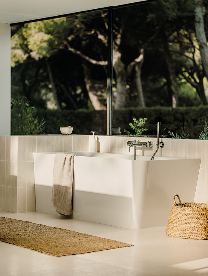 Para quienes prefieren pasar largo rato en la bañera es esencial contar con accesorios como las bandejas. La bandeja de madera de origen sostenible de la colección Tura encaja a la perfección en el reborde de la bañera y es ideal para apoyar un libro o una copa de vino. Asimismo, el reposacabezas Tura, fabricado con tejido reciclado, es un accesorio del que no podrás prescindir. Los aceites de aromaterapia, las velas y las sales de baño realzan aún más la experiencia sensorial, transformando un simple baño en un ritual rejuvenecedor.