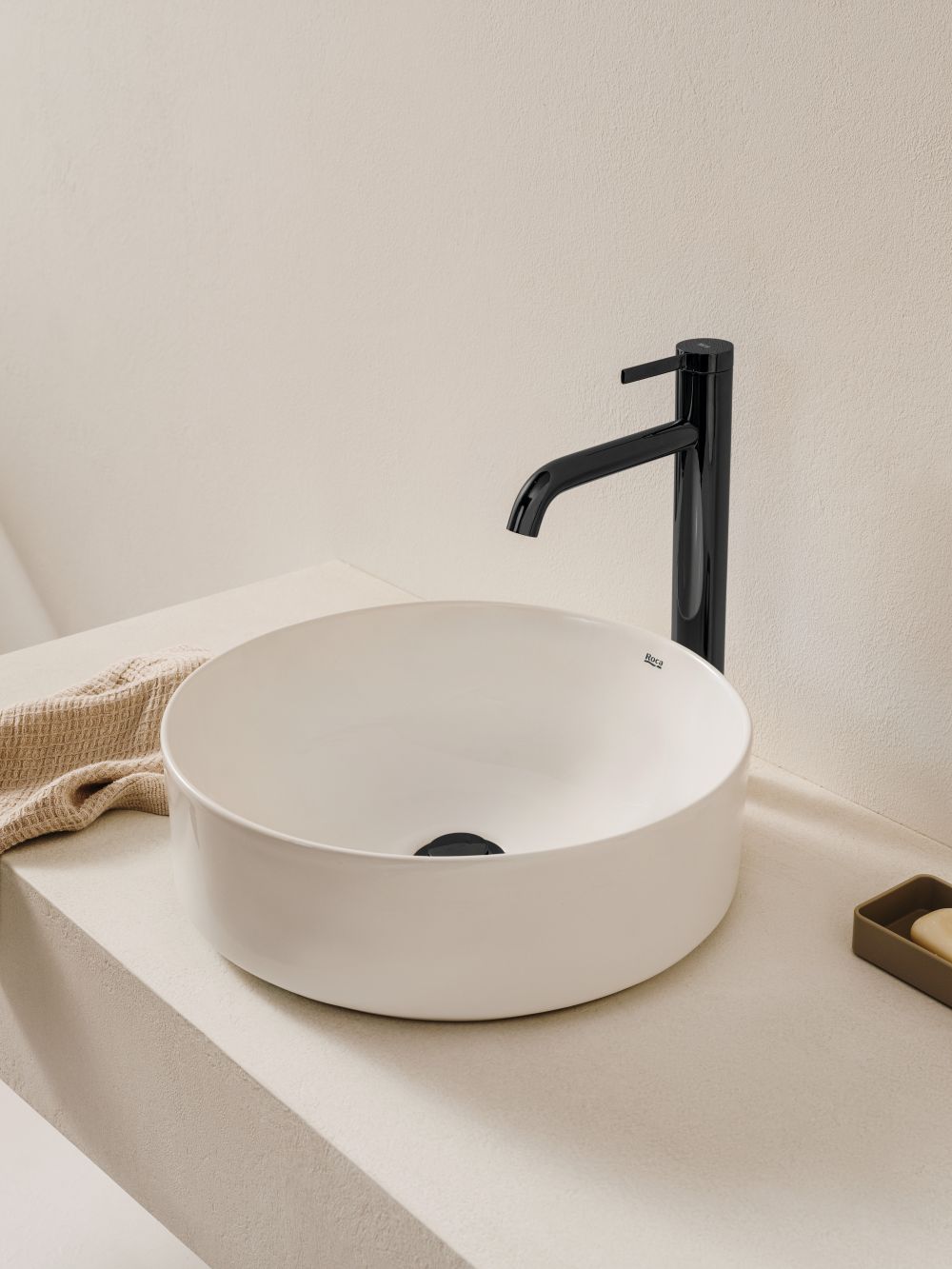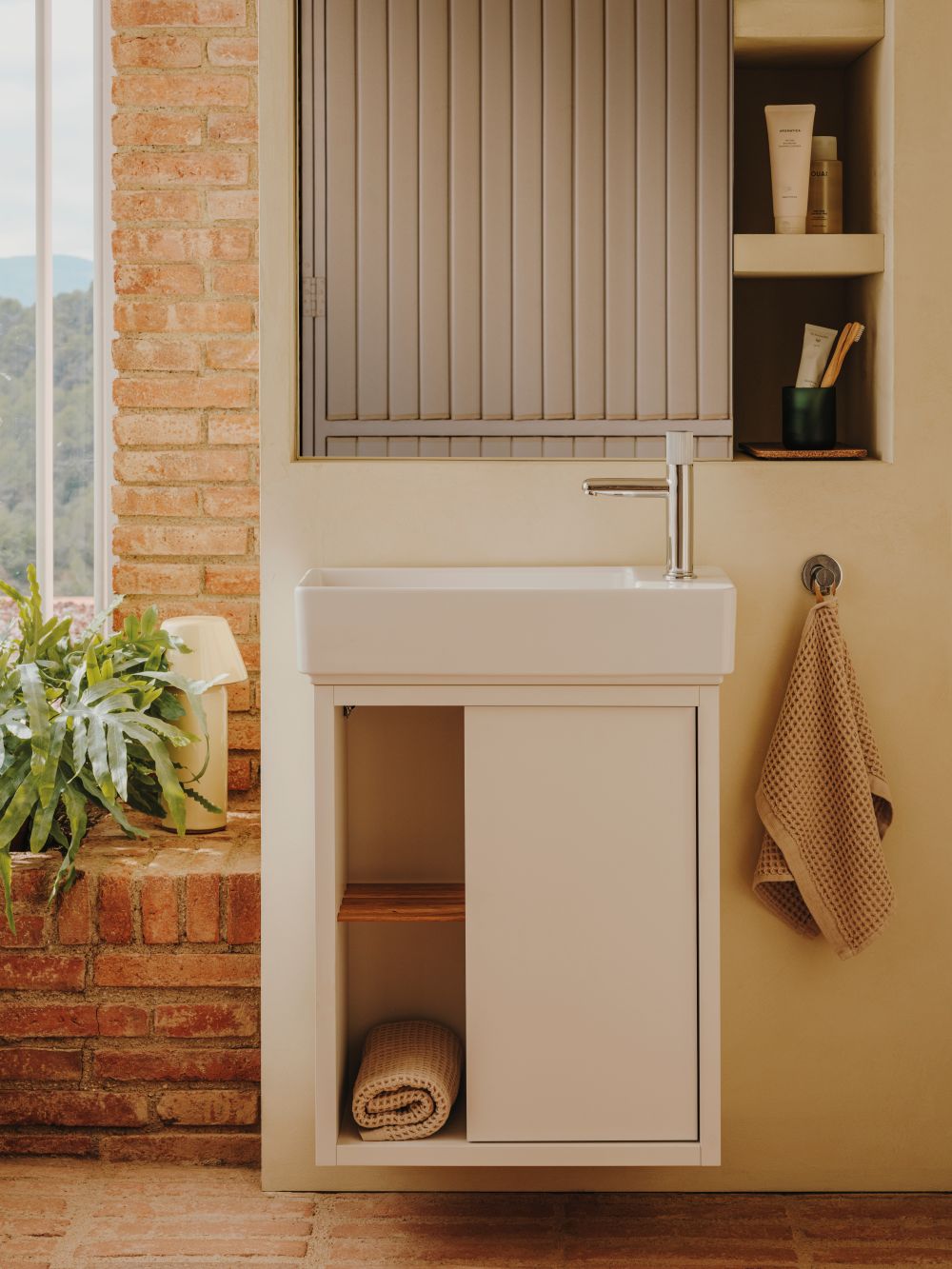 También es posible potenciar una paleta de colores neutros mediante inodoros en blanco mate, como los de las colecciones Ona y Tura o lavabos sobre encimera en blanco mate, que completan el look y aportan una sencillez natural al espacio.