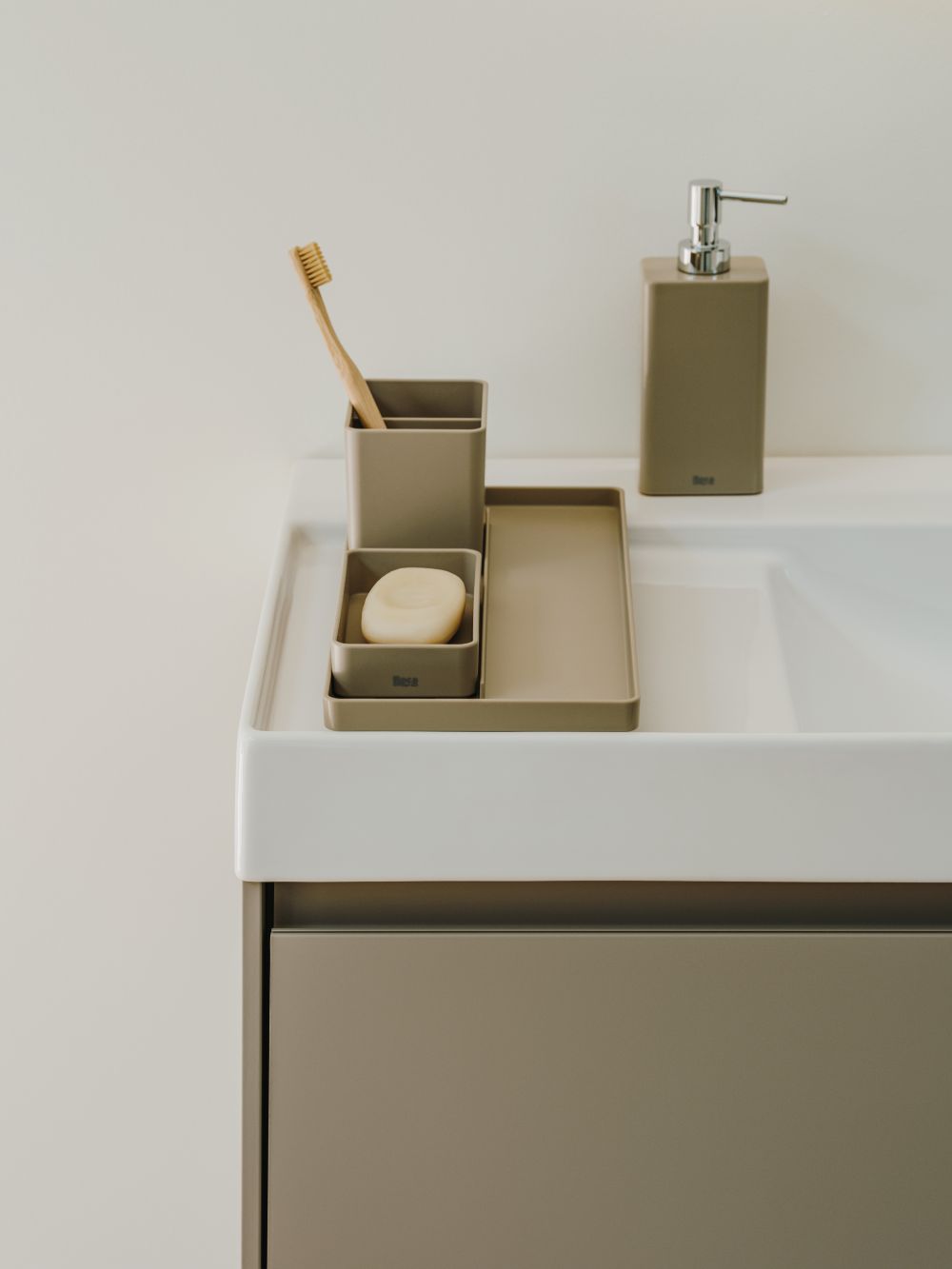 Colección Ona en gris arena: mueble base con accesorios a juego, como los dosificadores de jabón de encimera, el conjunto de bandejas y los vasos