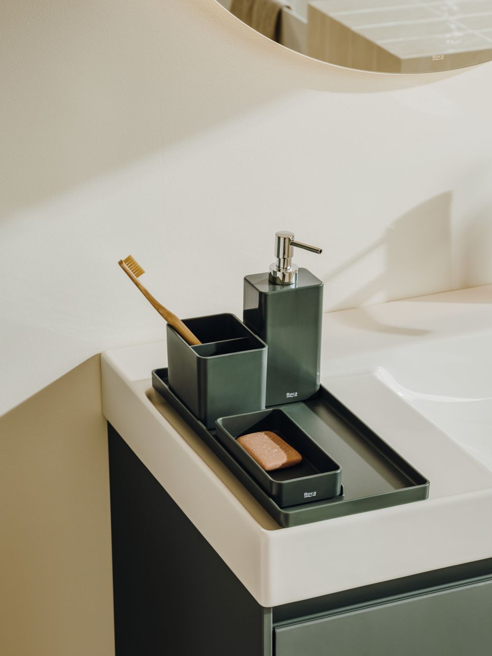 Un toque natural con la colección Ona en verde mate: mueble base Unik de dos cajones, bandejas, dosificadores de jabón, vasos y contenedores.