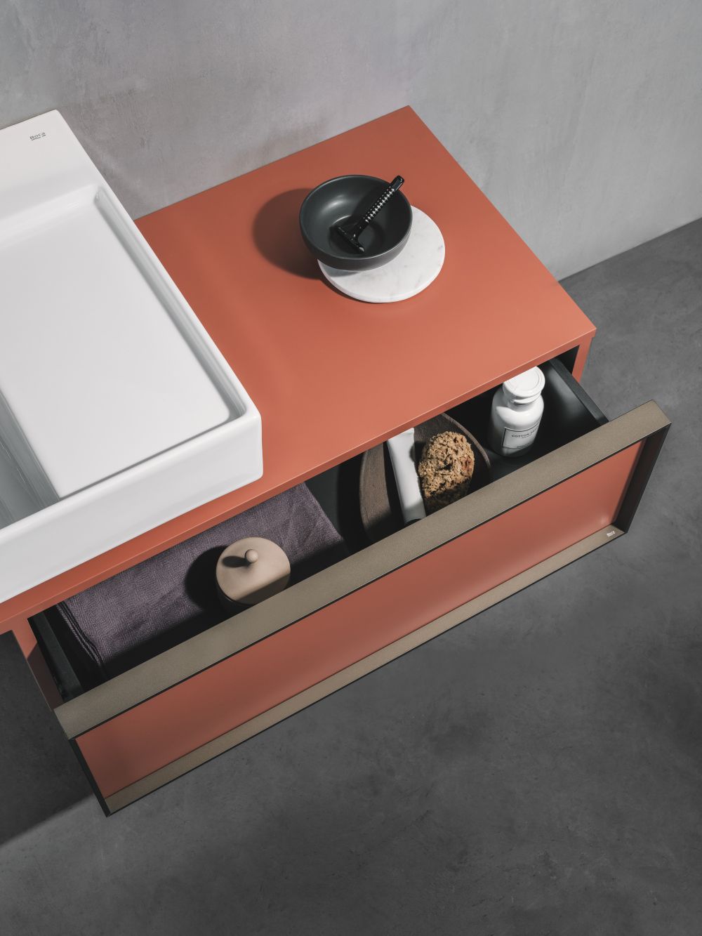 Mueble base de dos cajones y módulo auxiliar en terracota de la colección Verso