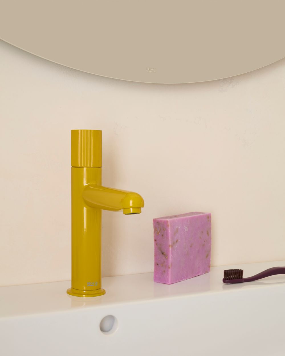 Añade una pincelada de color con la grifería de la colección Nu con maneta Stripes en amarillo miel
