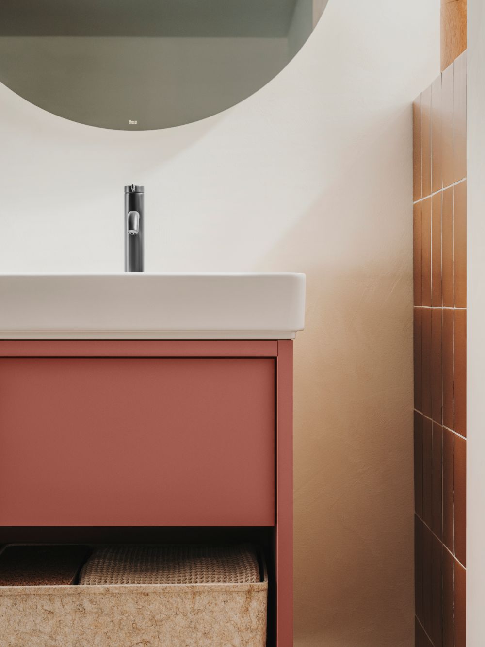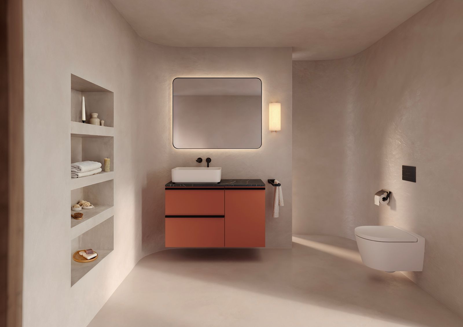 Los tonos tierra como el terracota, el caramelo, el arcilla y el topo aportan calidez al diseño minimalista, creando espacios modernos y acogedores. El acabado terracota de Verso e Inspira añade un toque de sofisticación, al igual que el acabado terracota claro de Tura, que aporta una pincelada de color. Estos acabados son especialmente indicados para baños pequeños, donde añaden profundidad sin recargar el diseño.