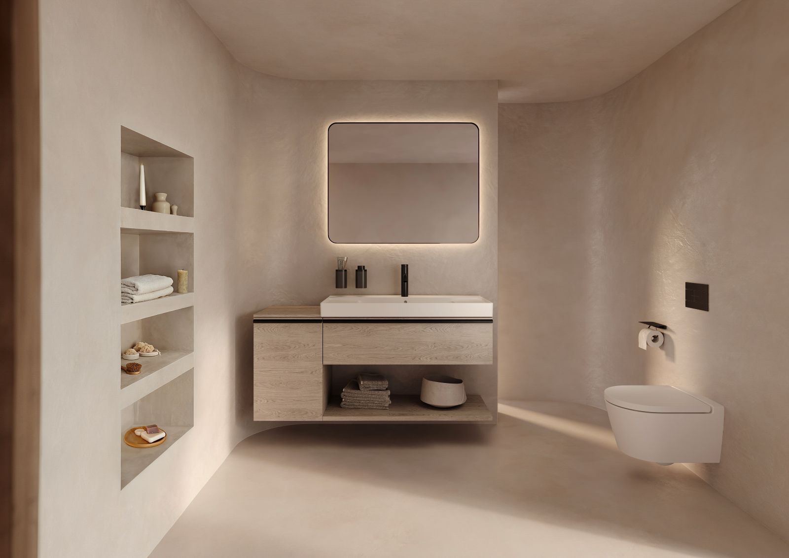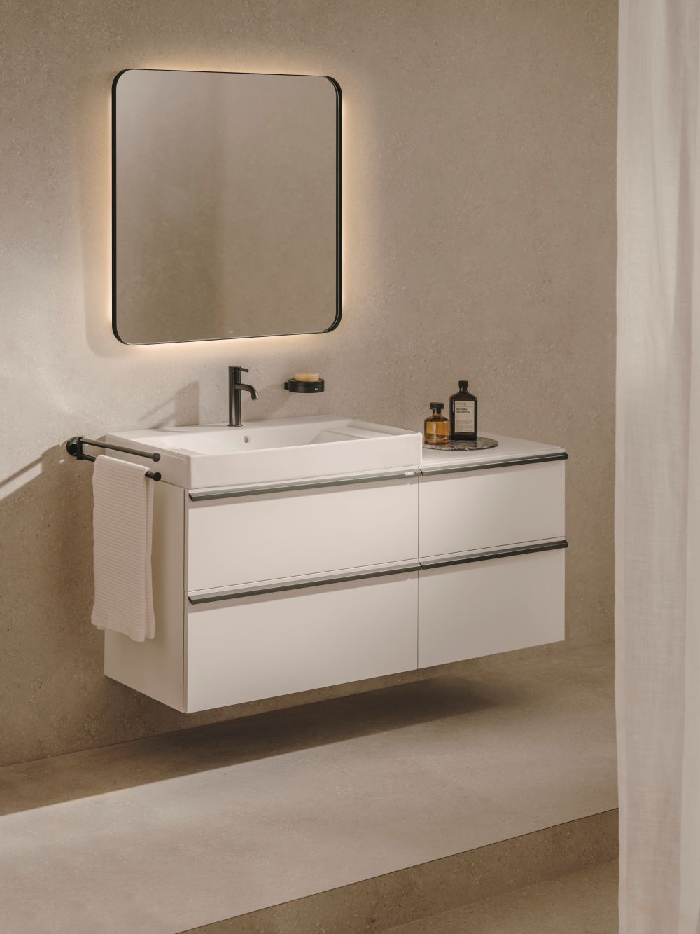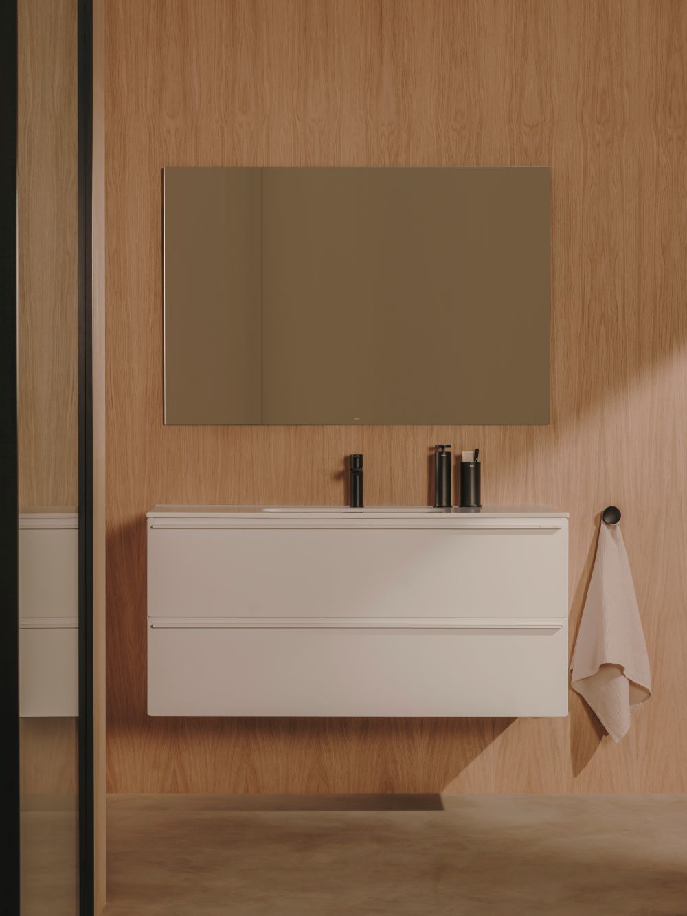 Los suaves tonos neutros continúan siendo la base del diseño de espacios de baño. Los diferentes acabados, como el blanco roto de Tura, los cálidos acabados arena y blanco mate de Ona y Volia o el gris piedra de la nueva colección Linea combinan a la perfección con muebles y módulos de almacenaje de diversos tamaños, ofreciendo una elegancia y versatilidad atemporales. Este efecto lo subraya la reconocida firma de color Pantone, que ha elegido Cloud Dancer como color del año 2026. Según explican, Cloud Dancer busca transmitir serenidad y ayudar a las personas a bajar el ritmo, cultivando una sensación de calma en un entorno acelerado y saturado de estímulos.