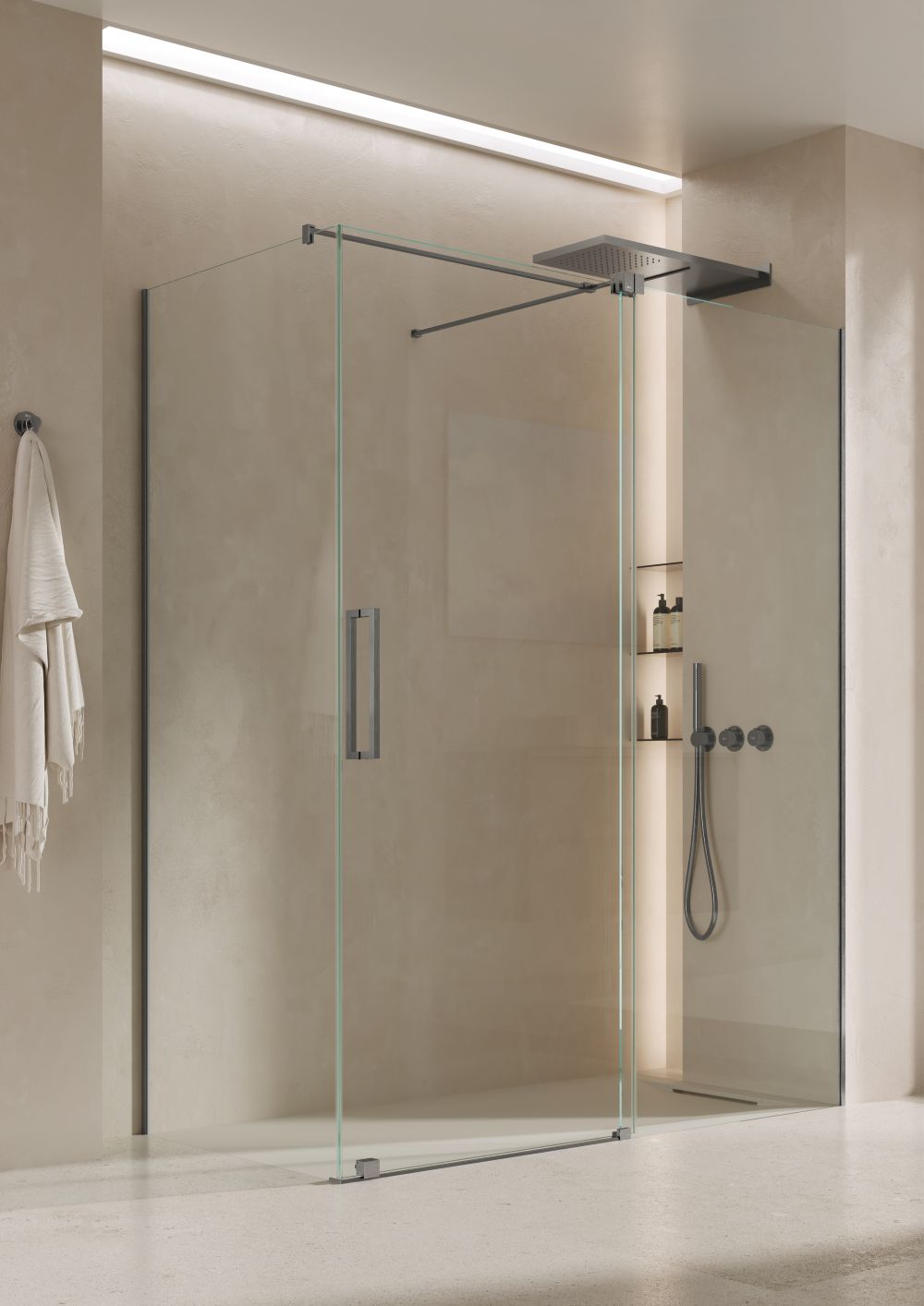 En lo que respecta al diseño, sustituir una bañera por una ducha walk-in incrementa la sensación de amplitud en el baño, haciéndolo más luminoso y diáfano. La integración natural de la ducha en el espacio, definida por sutiles detalles de diseño, aporta una estética coherente y unificada al conjunto del baño. Las mamparas de ducha transparentes, que reflejan la luz natural y artificial, crean el efecto de un espacio más amplio. Si optas por mamparas de ducha transparentes, como la hoja fija de la colección Ura o las hojas fijas o batientes sin marco de la colección Line, podrás personalizar el tamaño y la distribución de tu ducha ideal.
