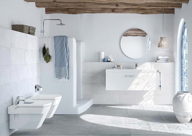 Pensada para adaptarse a los más diversos cuartos de baño, la colección Hall contempla bidés compactos para espacios reducidos e incluye en sus modelos con tapa unas visibles bisagras metálicas.