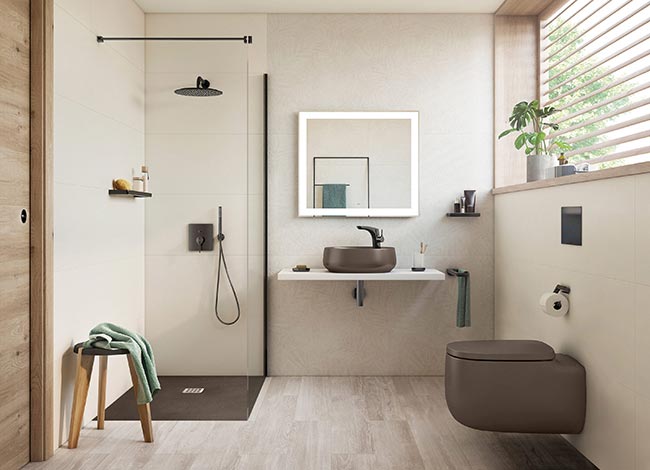 En duchas de mano, el color se alza como protagonista con dos opciones: Sensum Round con cuatro funciones para un máximo bienestar y Stella Stick en su versión Round con una forma tubular angosta. Además, se pueden crear sets y kits enteros que incluyan el color deseado tanto en el flexible como en los caños de bañera. En el diseño de espacios de ducha con una salida fija de agua, el rociador Rainsense de refrescante efecto lluvia aporta colorido tanto en su configuración cuadrada, como redonda, y también es posible contar con los sofisticados acabados de Everlux en brazos para pared o techo.