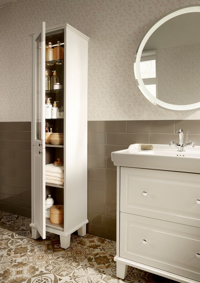 Elige siempre materiales resistentes a la humedad, como la madera tratada, el metal o los laminados hidrófugos. Los acabados como el negro mate, el veteado natural de la madera o el elegante blanco brillante pueden complementar o añadir un marcado contraste a la paleta de colores de tu baño. Con veinte acabados diferentes, el armario alto de una puerta Extra ofrece múltiples opciones de diseño y colorido para realzar el espacio de baño. Si tu estilo es más minimalista y moderno, opta por líneas depuradas y tonos neutros. Si prefieres un look más ecléctico o rústico, elige piezas de inspiración vintage, como la columna de una puerta de la colección Carmen con estantes regulables en altura, y lograrás aportar un plus de elegancia.