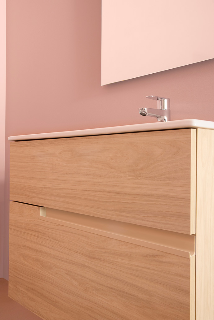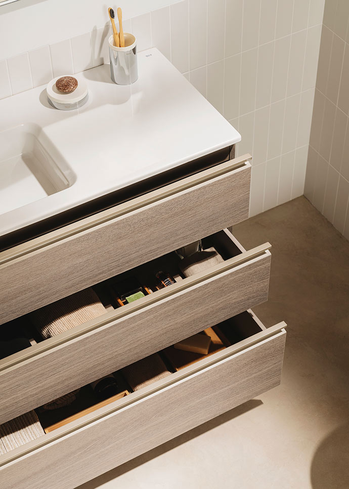En primer lugar, es primordial analizar nuestras necesidades de almacenaje. ¿Quieres utilizar el mueble de baño para guardar tus artículos de aseo, toallas y productos de limpieza? ¿Necesitas espacio adicional para el secador o la plancha del pelo? ¿Tenías pensado colocar una cesta para la ropa sucia? Los muebles de baño de la colección Tenue, elegantes y de generosas dimensiones, ofrecen diversas opciones de almacenaje. Sus cajones de extracción total disponen de un práctico compartimento donde ubicar artículos de diferentes tamaños. Asimismo, el estante abierto te permite colocar a la vista tus objetos favoritos.