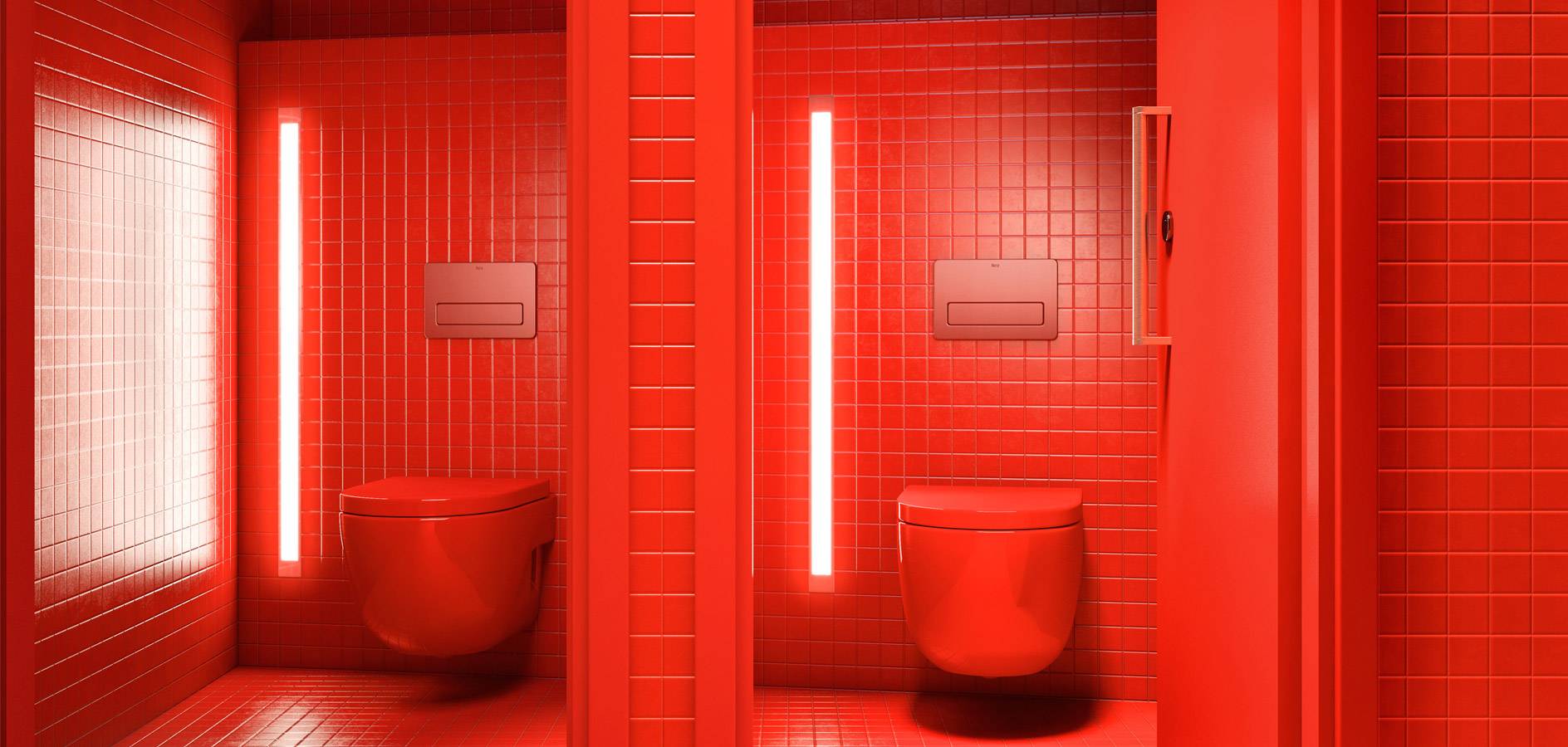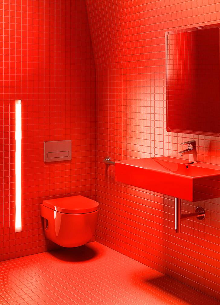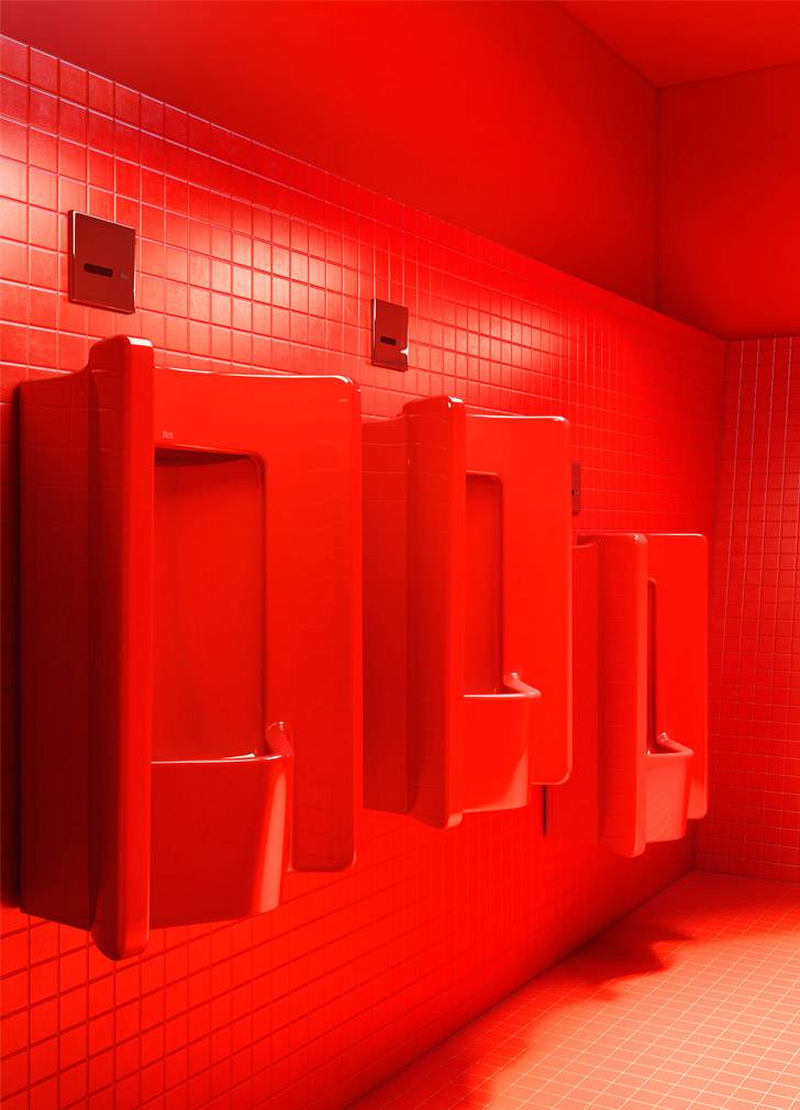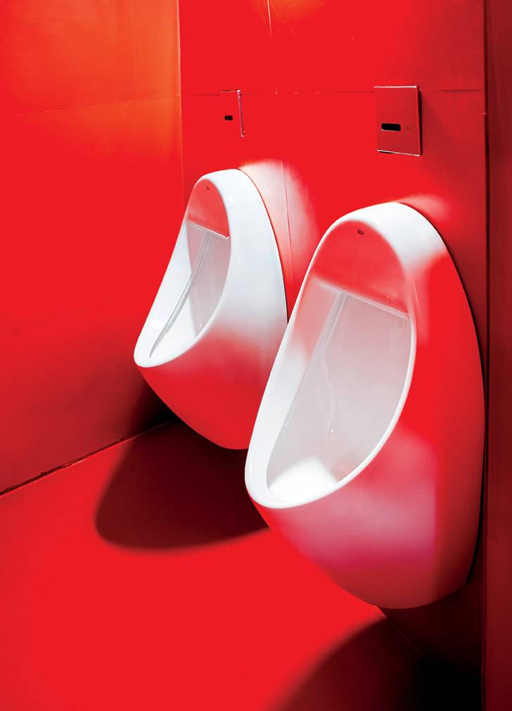Ocupando dos alturas y con el objetivo de integrar al visitante, el pabellón Ferrié, por su parte, ofrece una pequeña zona comercial, servicios de restauración, una sala de proyecciones y un recorrido museográfico al aire libre con diversas zonas de descanso. Su uso abierto a todos los visitantes supuso todo un reto a la hora de proyectar espacios de aseo que cumplieran con las más altas prestaciones de durabilidad y resistencia. Aquí, Moatti optó por una edición especial combinando algunas de las colecciones contemporáneas de Roca. El lavabo Diverta, el urinario Site y, de nuevo, el inodoro Meridian en su versión suspendida, fueron diseñados en un llamativo acabado en rojo para rendir homenaje al color con el que Gustave Eiffel proyectó inicialmente su mítica torre, símbolo de la Exposición Universal de 1889.