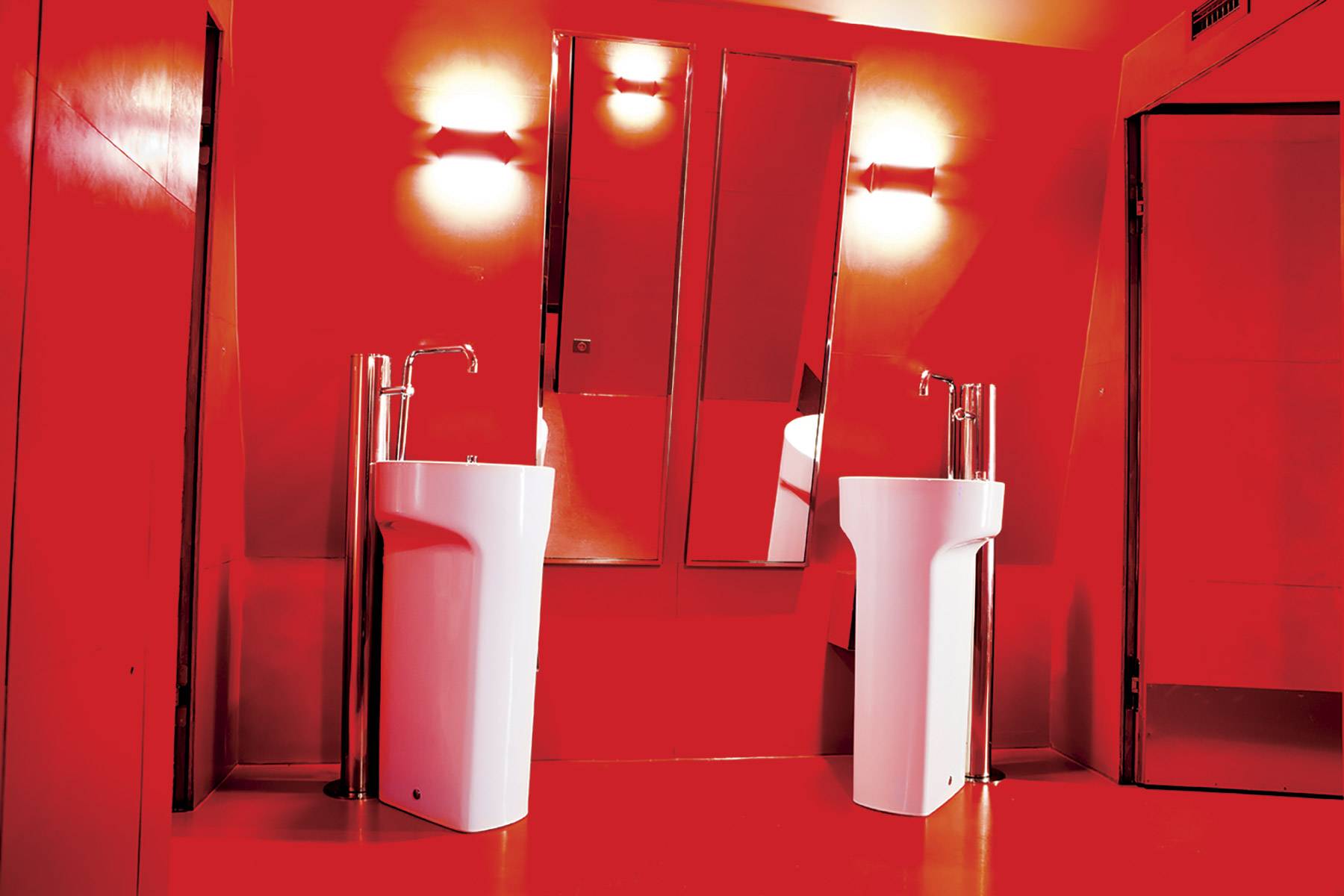 Concebido para uso privado, el pabellón Eiffel, en el primer piso, cuenta con una sala de conferencias con capacidad para 300 personas y fue el primer espacio de la torre en usar toda la gama de productos Roca desde la porcelana a la grifería, pasando por los sistemas de instalación y las placas de accionamiento. Dispuesto en un espacio de paredes de intenso rojo veneciano, el blanco de los urinarios, inodoros y lavabos Roca contrasta con el llamativo tono de la pared, que fue en su día el original de toda la torre. Inspirándose en este dato desconocido para muchos visitantes, el arquitecto responsable del proyecto, Alain Moatti, eligió el lavabo Amberes y el inodoro Meridian en su versión suspendida para crear un contraste entre curvas y rectas, firmando su personal homenaje en un diálogo entre el rojo y el blanco.