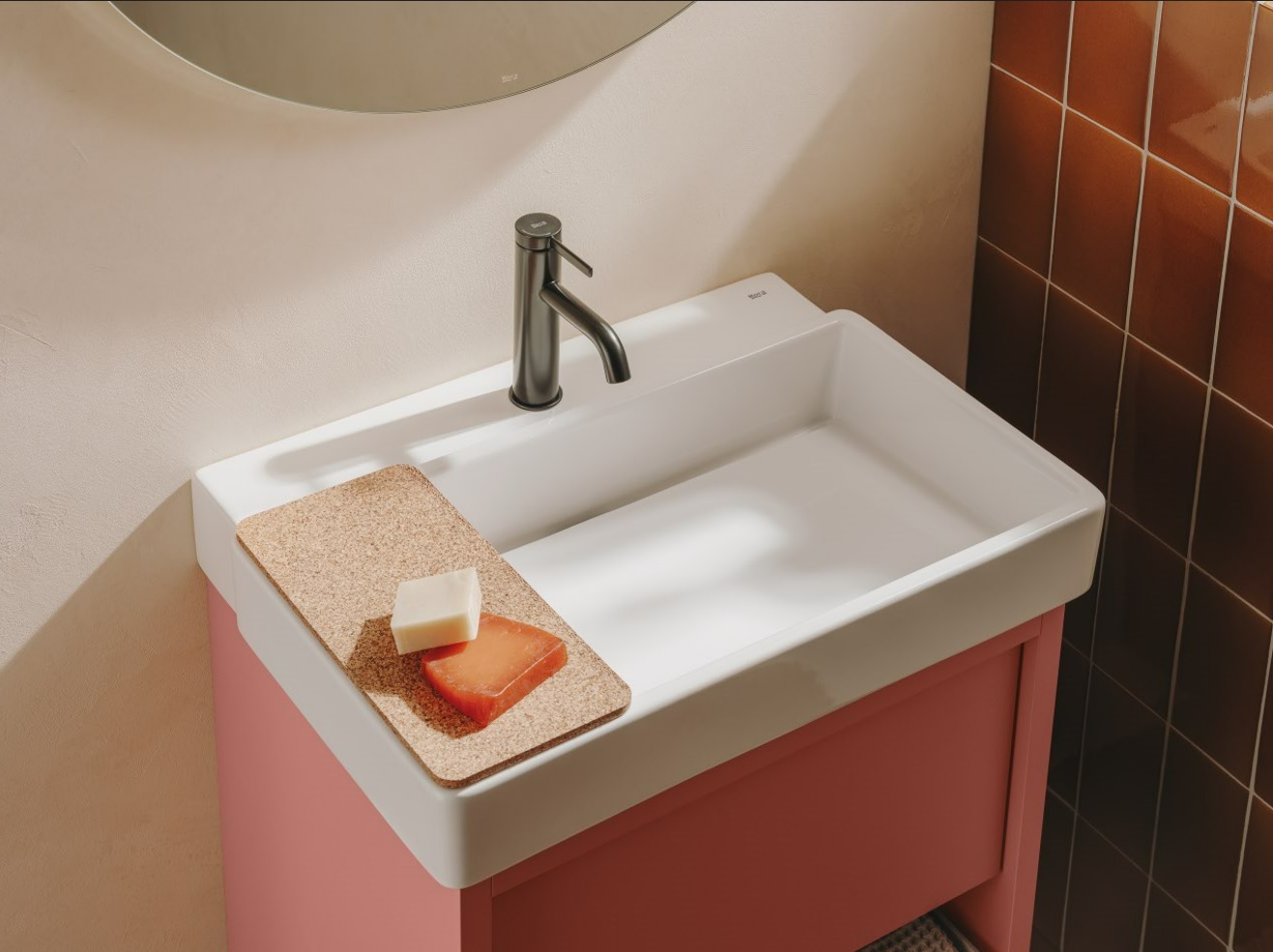 ✓ Tapa de corcho reciclado para las cajas que también sirve de bandeja para los lavabos.