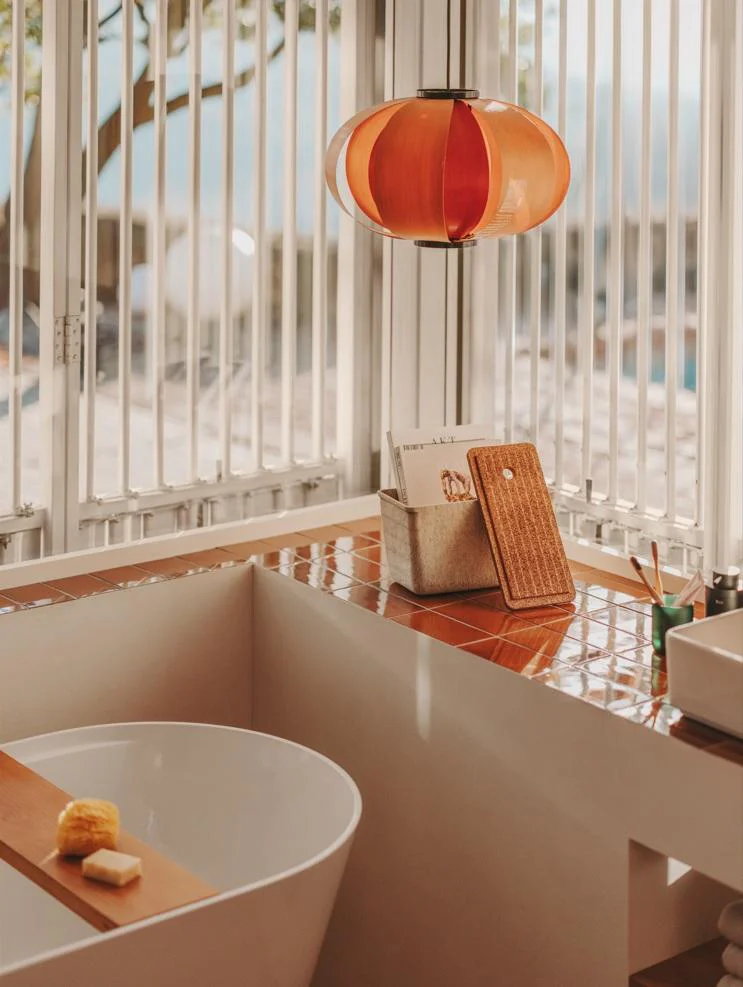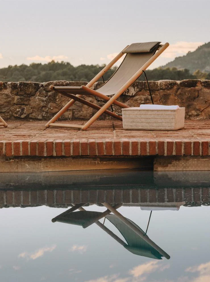 Una pequeña almohada y una atractiva bandeja de baño de madera, ambas para la bañera, completan la colección. El exclusivo apoyacabezas, hecho a mano, está fabricado con tejido reciclado de secado rápido y cuenta con un contrapeso de madera para ajustar fácilmente la altura elegida.
