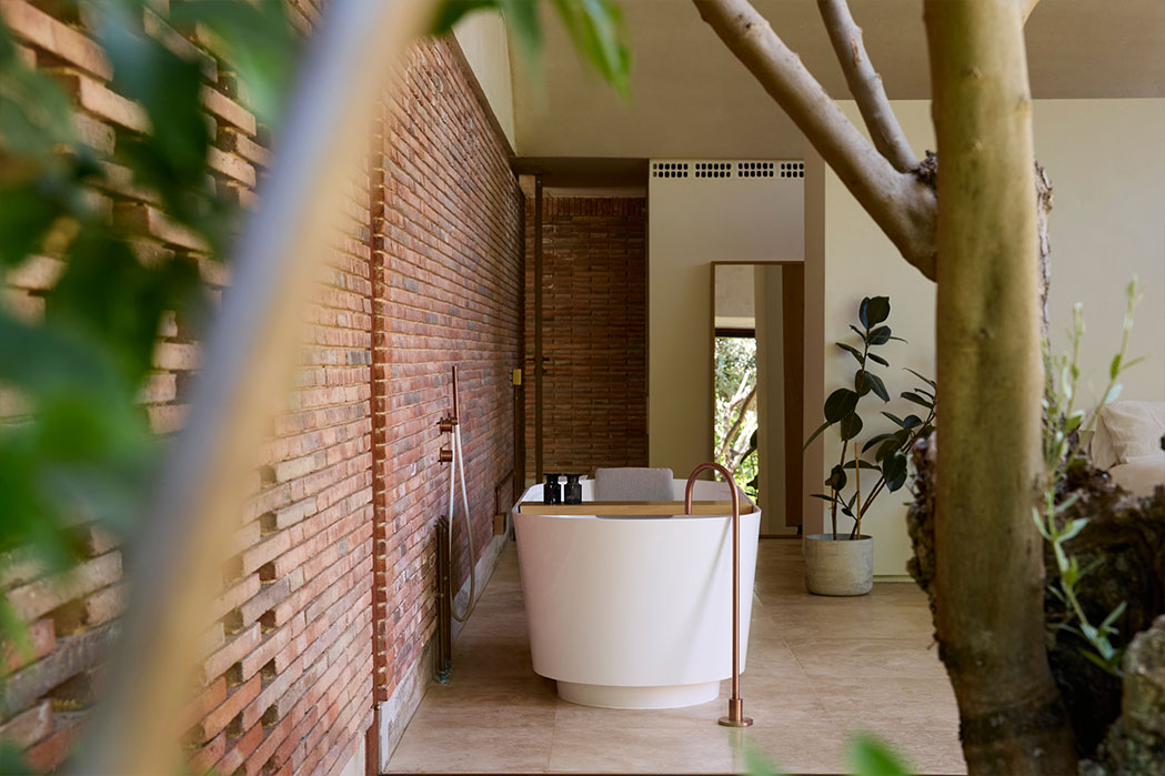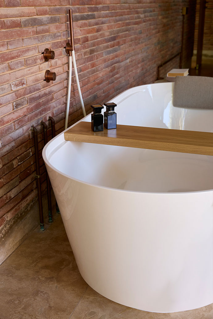 La bañera, por ejemplo, no es un elemento aislado. Es parte integrante del dormitorio y actúa como una pieza central, casi vital, que refleja la esencia del estilo de vida mediterráneo.