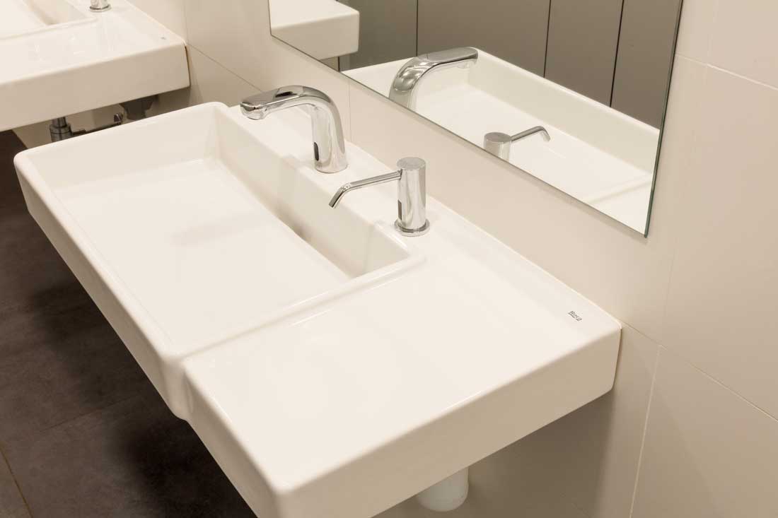 | Productos Roca | Lavabo asimétrico mural Tura con cubeta a la izquierda, lavabo mural Tura, grifería electrónica de lavabo L20, lavabo mural Access, dosificador de jabón o desinfectante de manos Ona-E, grifería de ducha mural Victoria Pro, maneta para personas con movilidad reducida, inodoro suspendido Roca Rimless® Tura, inodoro suspendido Roca Rimless® Access, placa de accionamiento antivandálica PL10-E One, plato de ducha extraplano de Stonex® Terran, bastidor con cisterna compacta autoportante de doble descarga para inodoro suspendido Duplo WC One, tapa y asiento con caída amortiguada Tura, asiento con fijaciones reforzadas Access, espejo basculante Access Comfort, secador de manos con sensor Public, asa de baño abatible Access Comfort, percha Superinox, dispensador mural de toallas Public, dispensador mural de papel higiénico Public, papelera Public de 6 litros, asiento de ducha abatible Access, asa de baño abatible 135° Access Comfort, conjunto de desagüe con rebosadero exterior y sifón empotrable Access, espejo Luna. |