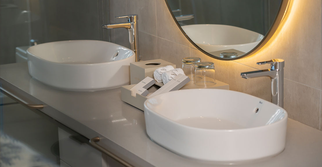 Las soluciones de baño Roca son el complemento perfecto de los espacios fluidos del hotel. El elegante inodoro Inspira, el lavabo The Gap Round y la grifería de caño alto L20 destacan por su estilo minimalista que transmite una sensación de tranquilidad y armonía. La aparente sencillez de las griferías Loft y Atlas contribuye a acentuar ese ambiente de serenidad, logrando que los huéspedes se vean transportados a un oasis de sofisticación, ya sea bañado por la luminosidad del día o por la vitalidad nocturna.