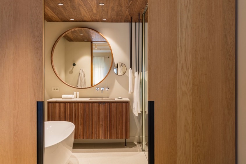 Al igual que el chocolate elaborado artesanalmente en el obrador situado en la planta baja del edificio, cada habitación del hotel ha sido cuidadosamente diseñada con la máxima precisión y esmero. La misma atención al detalle está presente en los baños, convertidos por los diseñadores en espacios únicos e íntimos que se funden con el dormitorio principal.