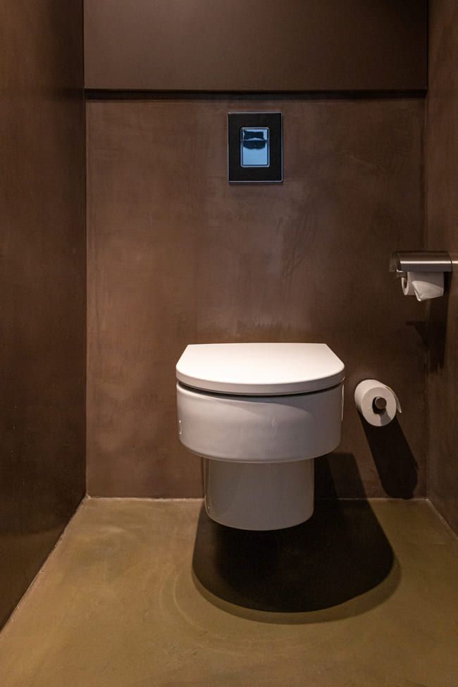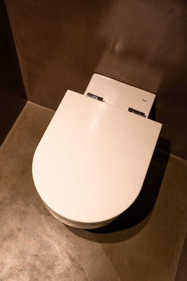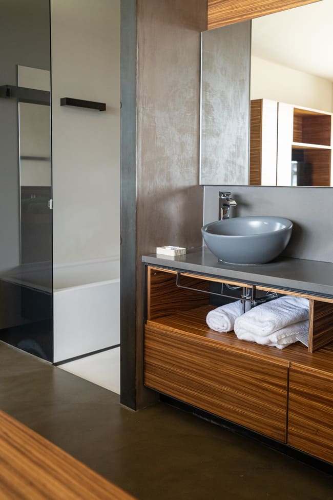 La vistosa grifería Thesis, diseñada por Antonio Bullo, presenta un diseño moderno y dinámico de líneas limpias y formas minimalistas, que aportan elegancia y estilo al espacio de baño. El histórico lavabo Bol en color grafito, colocado sobre una encimera de madera, y el inodoro Happening, de inspiración arquitectónica, contribuyen a la sofisticada estética de las habitaciones, reforzando su conexión con la arquitectura del hotel y su entorno. Este interiorismo es el ejemplo perfecto de cómo el diseño moderno puede combinarse de forma armoniosa con elementos tradicionales para crear espacios funcionales y visualmente impactantes.