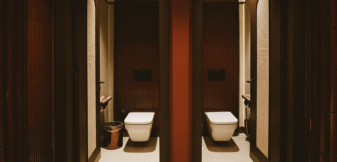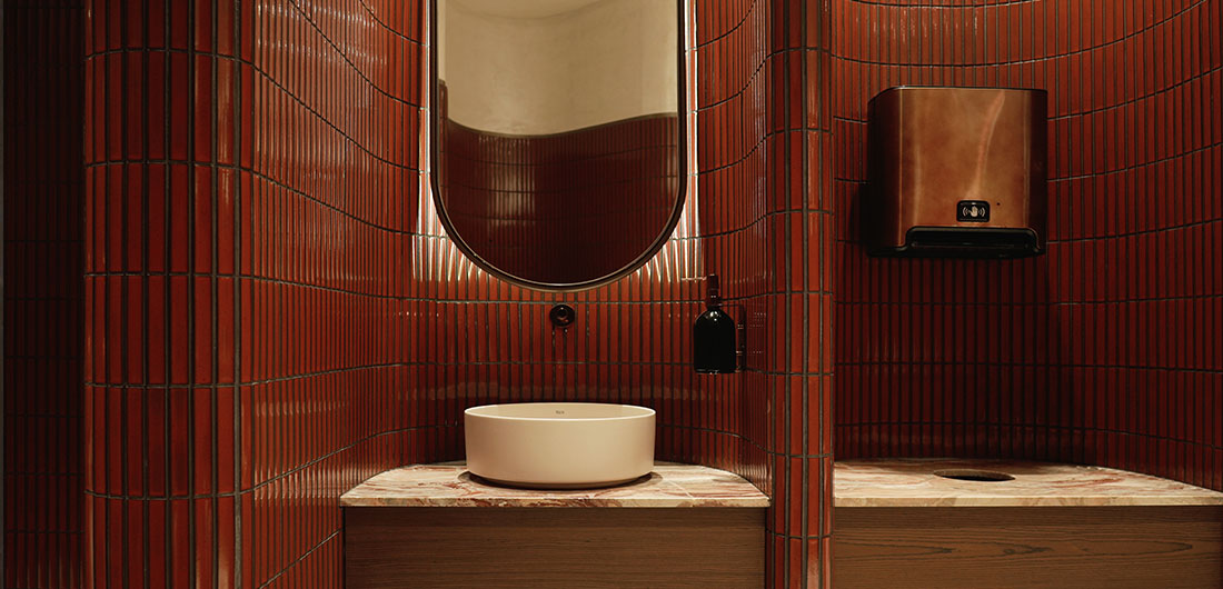 La cerámica presente en los aseos, diseñada específicamente para este proyecto, es una muestra del interés del restaurante por combinar el confort moderno con elementos culturales. El objetivo es mantener una estética cohesionada y, por ese motivo, los aseos, al igual que todo el restaurante, son un ejemplo de naturalidad y atemporalidad.