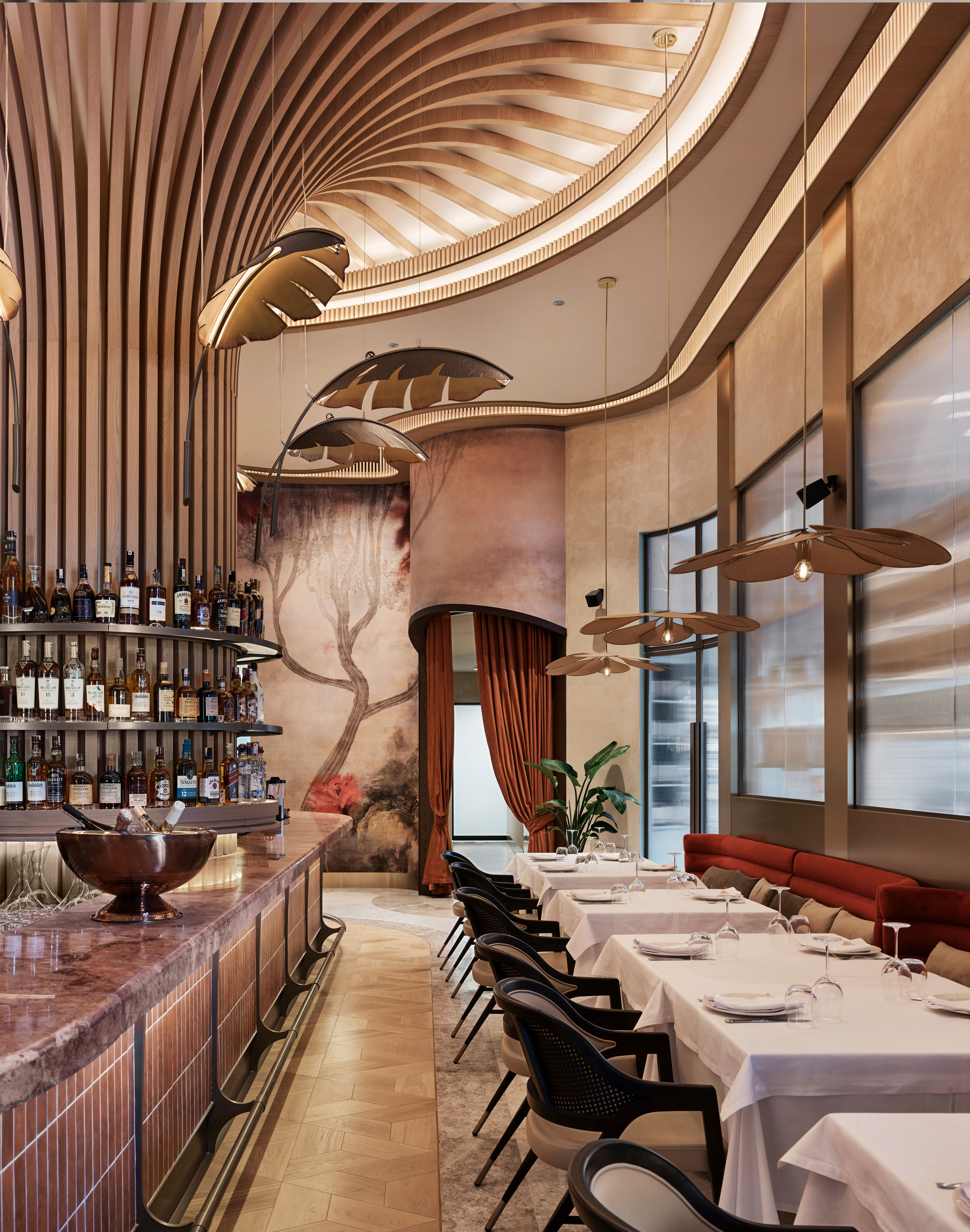 En línea con este planteamiento de diseño, cada pequeño detalle ha sido concebido para realzar el look natural y orgánico del espacio. Las diferentes salas, en las que encontramos desde elementos vegetales tras los cristales hasta el intrincado uso de la cerámica y la piedra natural, evocan una sensación de armonía y calidez, convirtiendo la experiencia gastronómica en un viaje cultural envolvente.