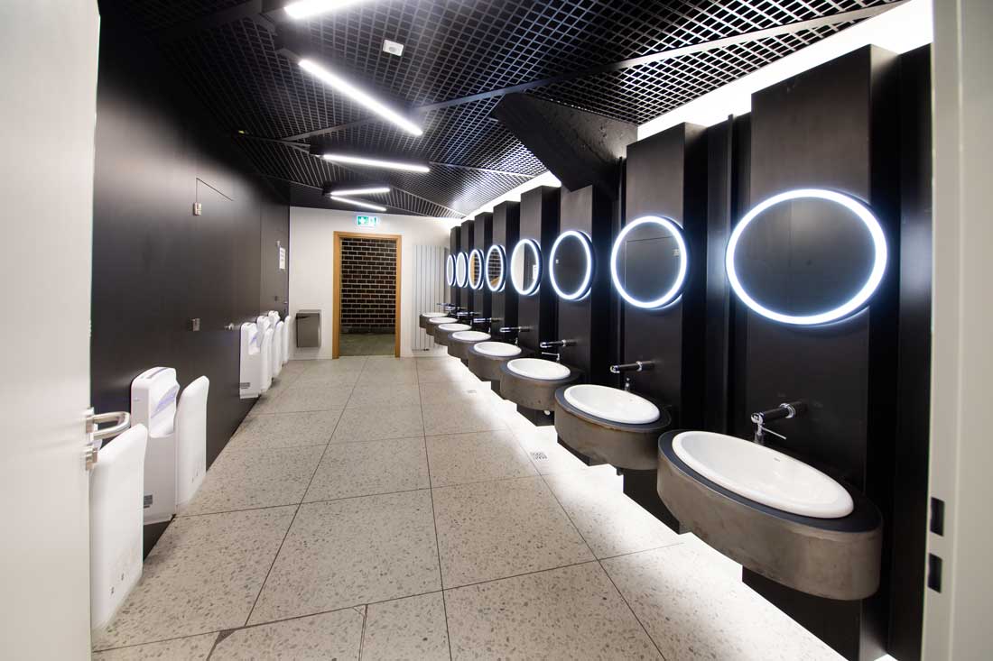 En la misma línea, se han escogido lavabos de porcelana que pueden ser compartidos por varios usuarios al mismo tiempo para resistir a su uso intensivo, a la vez que encajan a la perfección en la estética del conjunto. El lavabo mural de Fineceramic® Beyond, con una forma redondeada muy similar al diseño del estadio, se presenta como la elección perfecta, acompañada de los modelos Hall y Neo Selene, que mejoran la experiencia en el espacio de baño. La grifería electrónica de lavabo L20 en cromado y la grifería temporizada empotrable Avant ofrecen una gran eficiencia energética y están diseñadas para soportar un uso intensivo. En los espacios de baño públicos para hombres se ha instalado una hilera de urinarios de porcelana de la colección Chic, mientras que en los femeninos destaca la combinación de inodoros de pie y suspendidos de la colección Nexo con sistemas de descarga Duplo.
