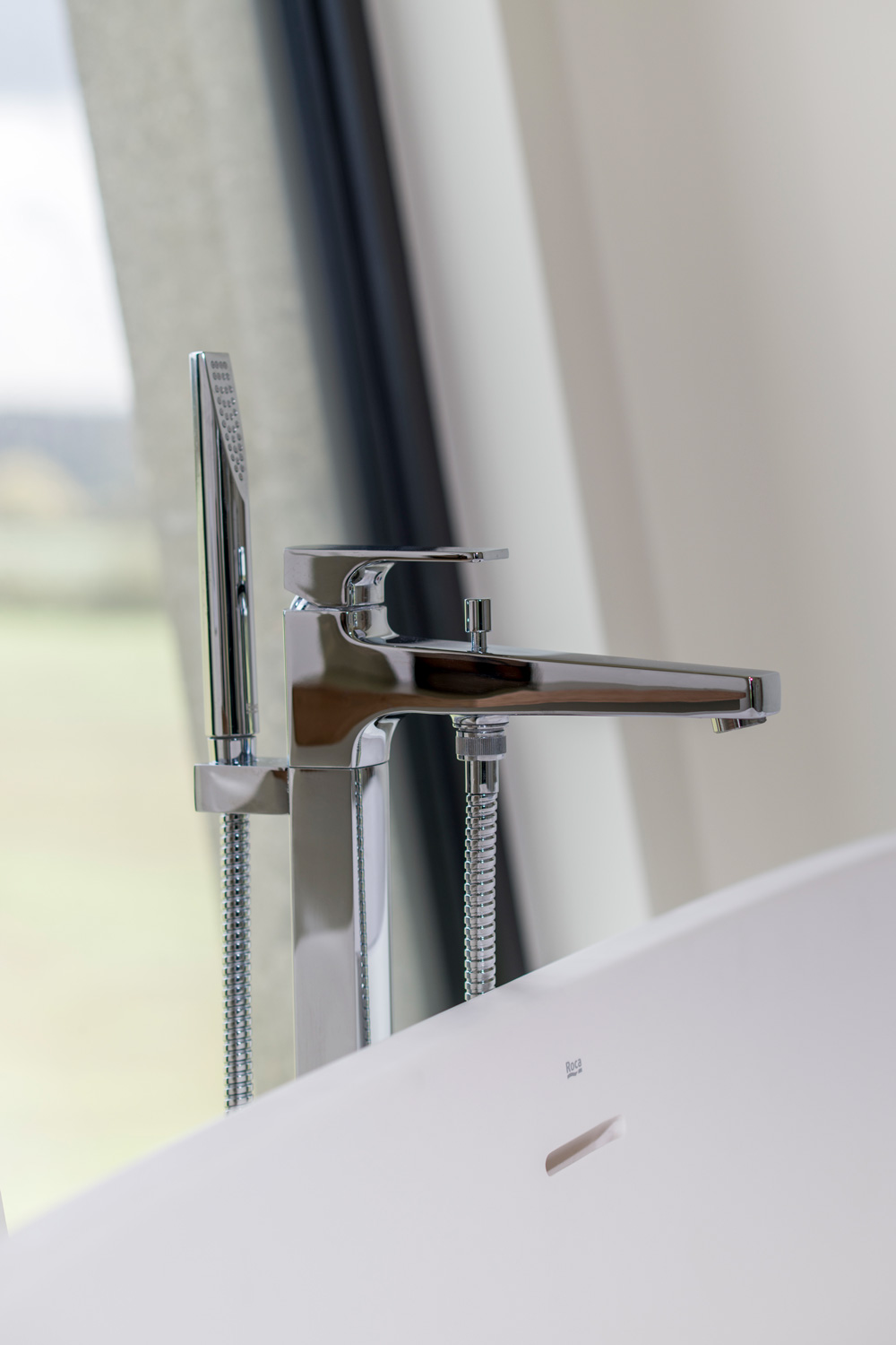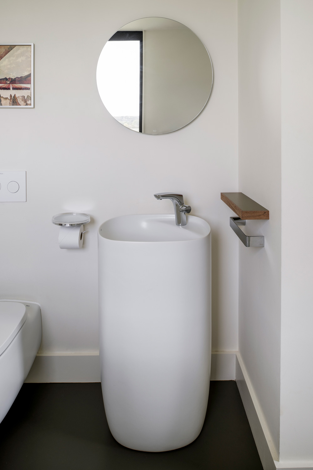 Para el espacio de baño principal en suite se escogió la colección Beyond de Roca en blanco mate, que incluye el inodoro suspendido Beyond, el lavabo totem Beyond, con una forma escultural que recuerda a la silueta del depósito de agua y la bañera de Surfex®, que destaca por sus suaves líneas redondeadas, perfectas para disfrutar de largos baños. Además de aportar armonía visual al imitar la forma del edificio, estos elementos crean una atmósfera de serenidad.
